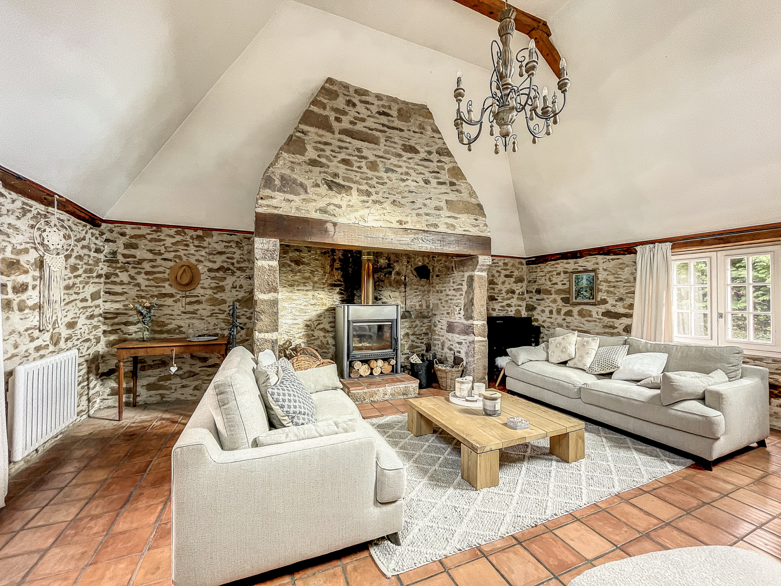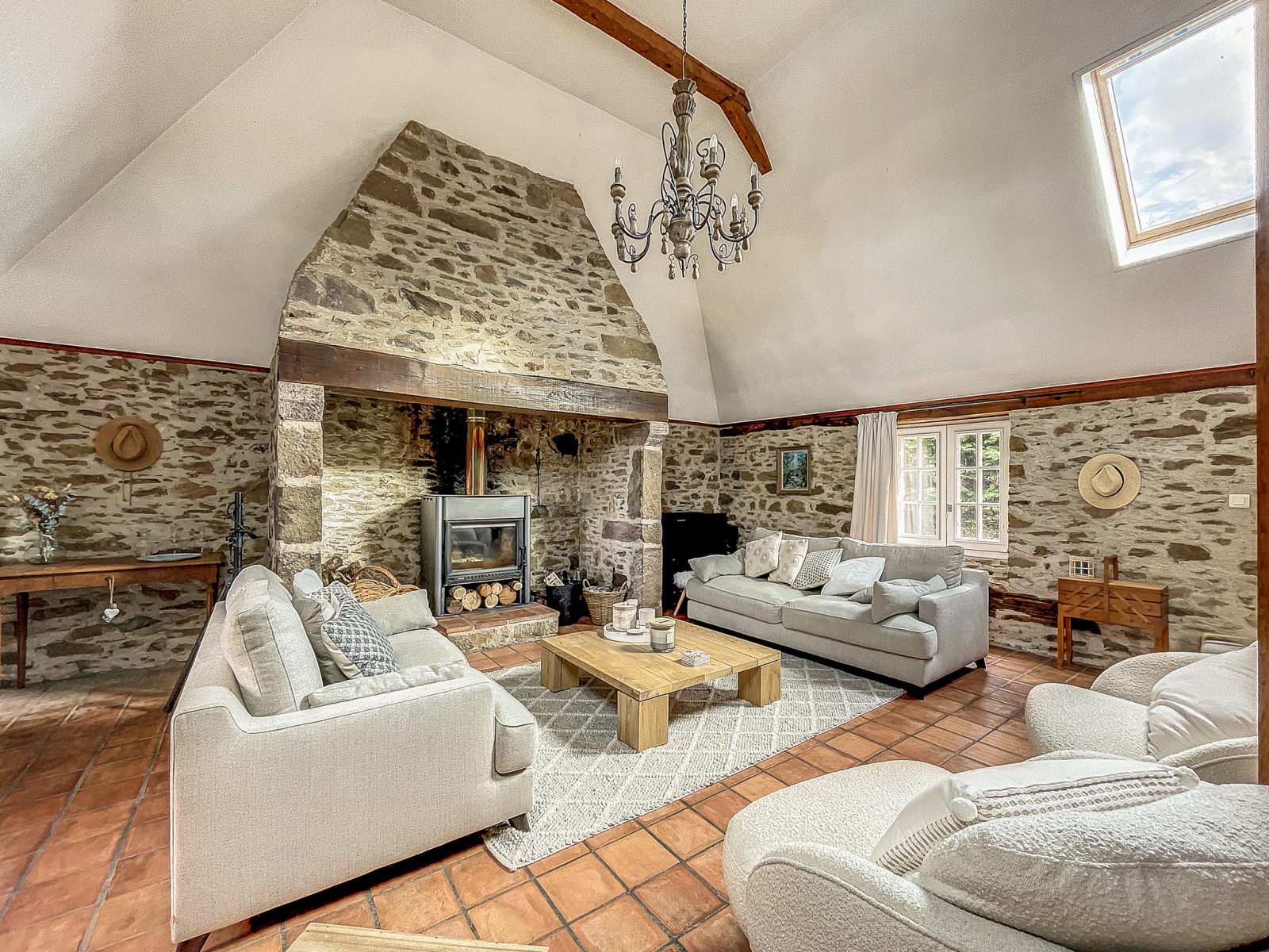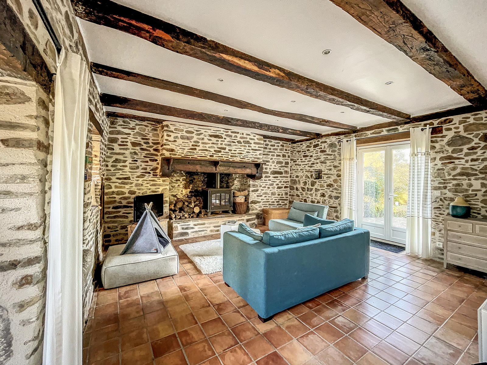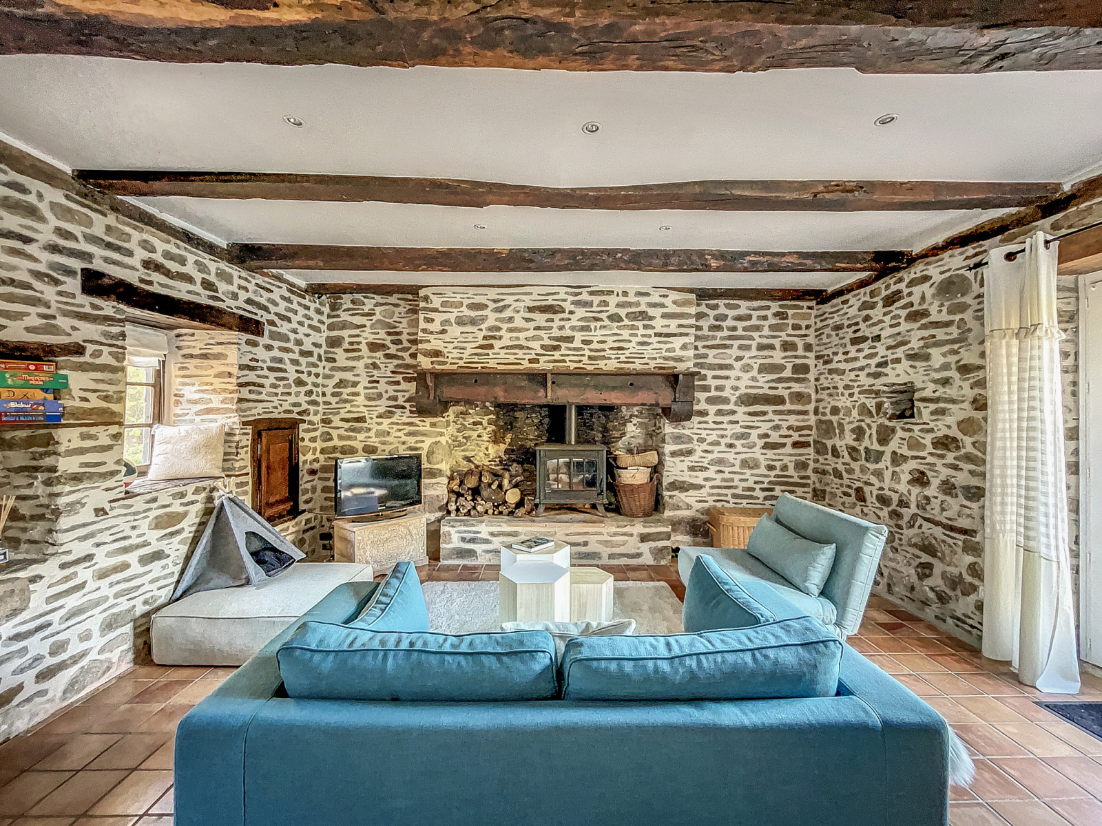 La seconde partie de la bâtisse est constituée d'un grand salon disposant d'un cantou au sein duquel un poêle à bois est installé et une ancienne bassière en pierre typique des maisons rustiques de la région. Cet espace dispose aussi d'une salle d'eau et d'une chambre avec WC à l'étage. La maison dispose également d'une chambre indépendante intégrée dans le prolongement de la maison et d'un garage avec carport.