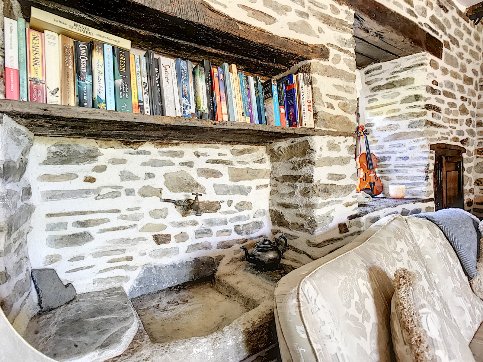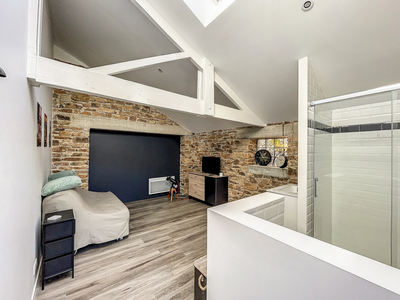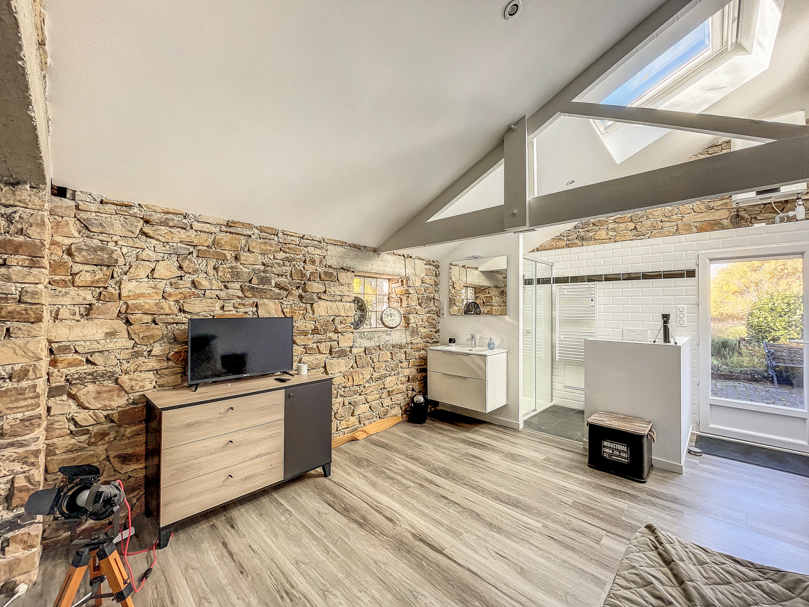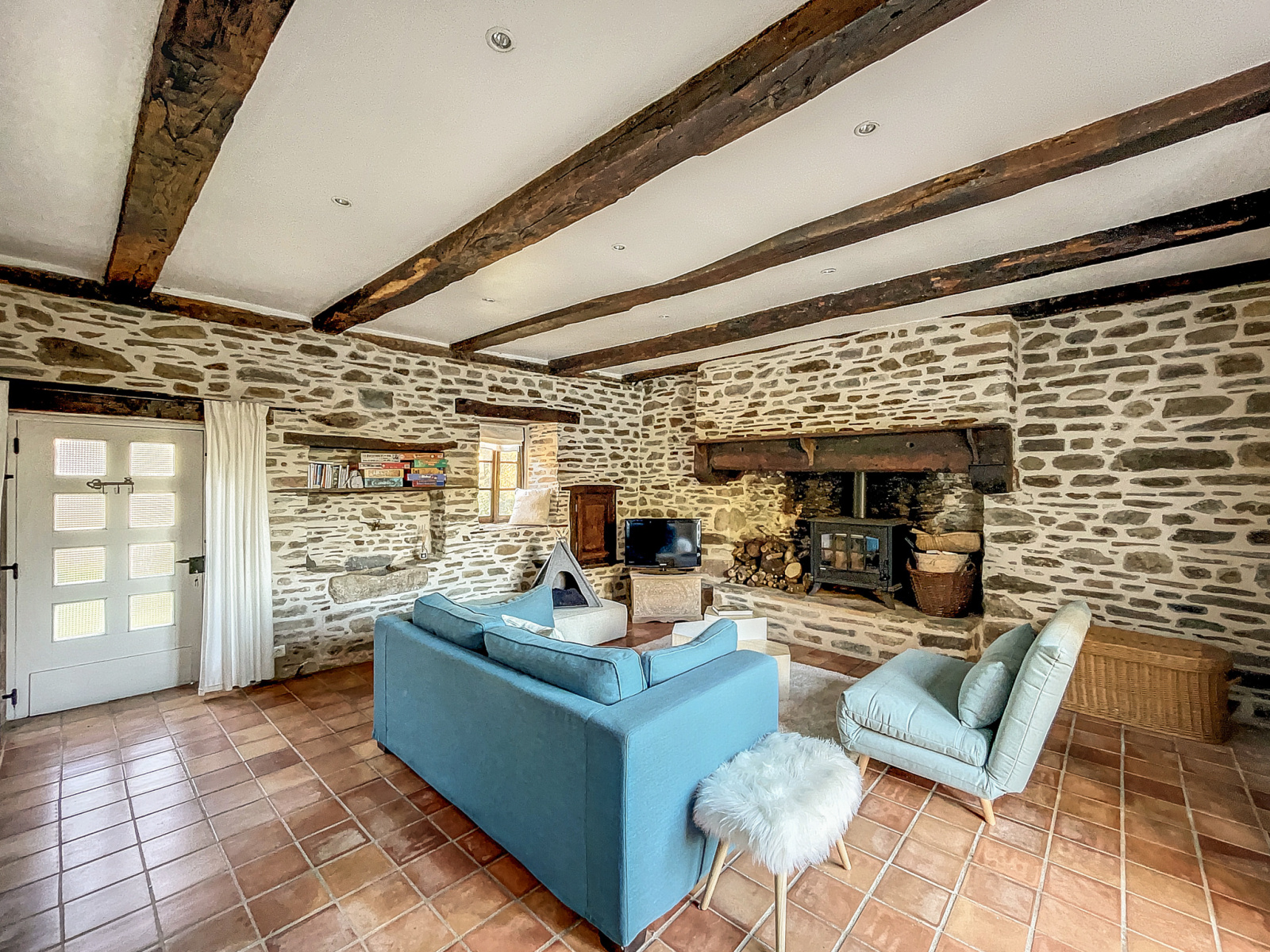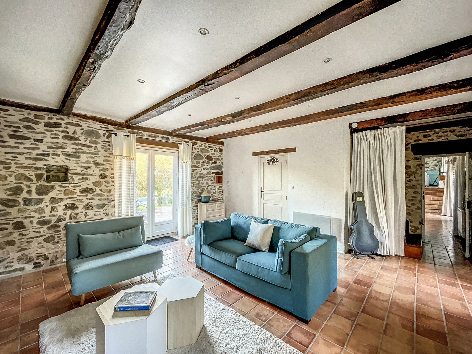 La seconde partie de la bâtisse est constituée d'un grand salon disposant d'un cantou au sein duquel un poêle à bois est installé et une ancienne bassière en pierre typique des maisons rustiques de la région. Cet espace dispose aussi d'une salle d'eau et d'une chambre avec WC à l'étage. La maison dispose également d'une chambre indépendante intégrée dans le prolongement de la maison et d'un garage avec carport.