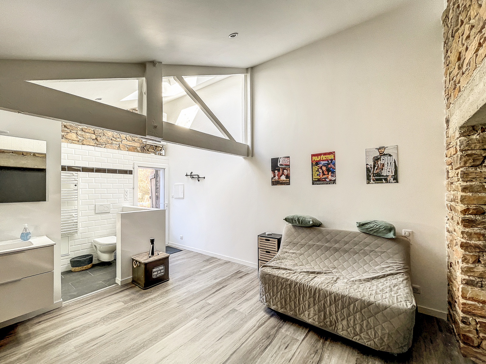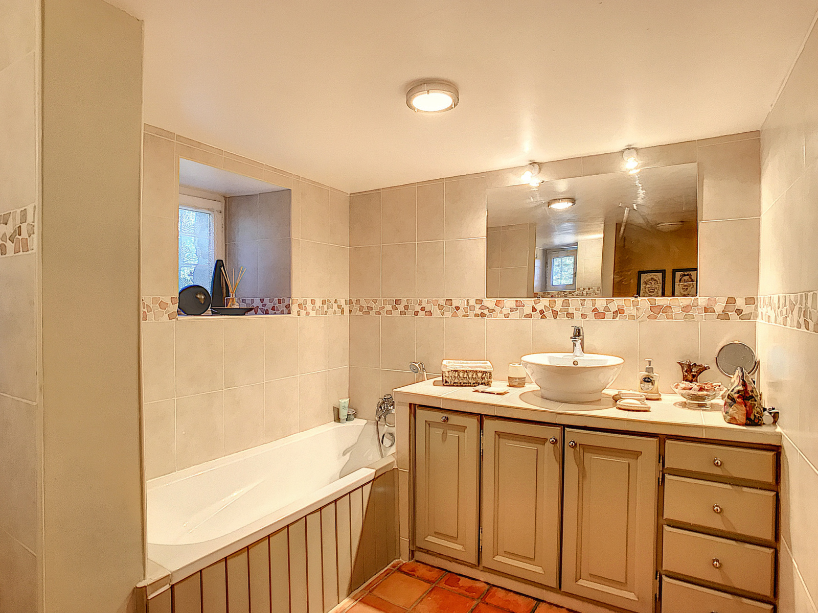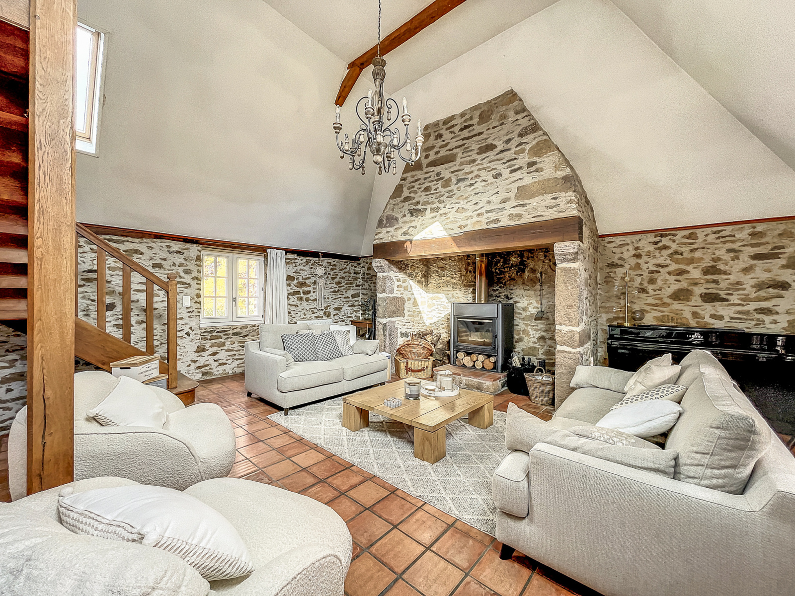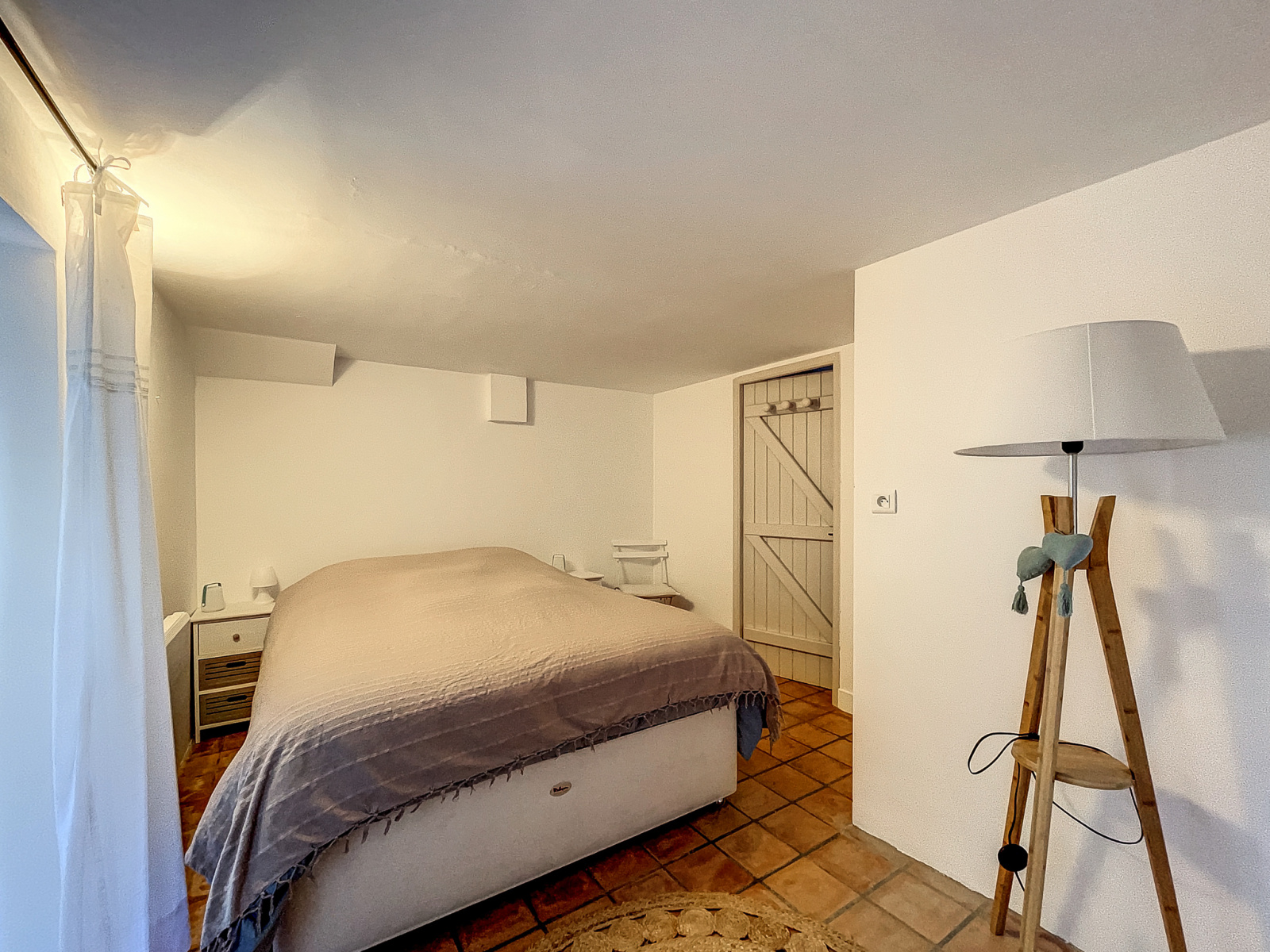 La seconde partie de la bâtisse est constituée d'un grand salon disposant d'un cantou au sein duquel un poêle à bois est installé et une ancienne bassière en pierre typique des maisons rustiques de la région. Cet espace dispose aussi d'une salle d'eau et d'une chambre avec WC à l'étage. La maison dispose également d'une chambre indépendante intégrée dans le prolongement de la maison et d'un garage avec carport.