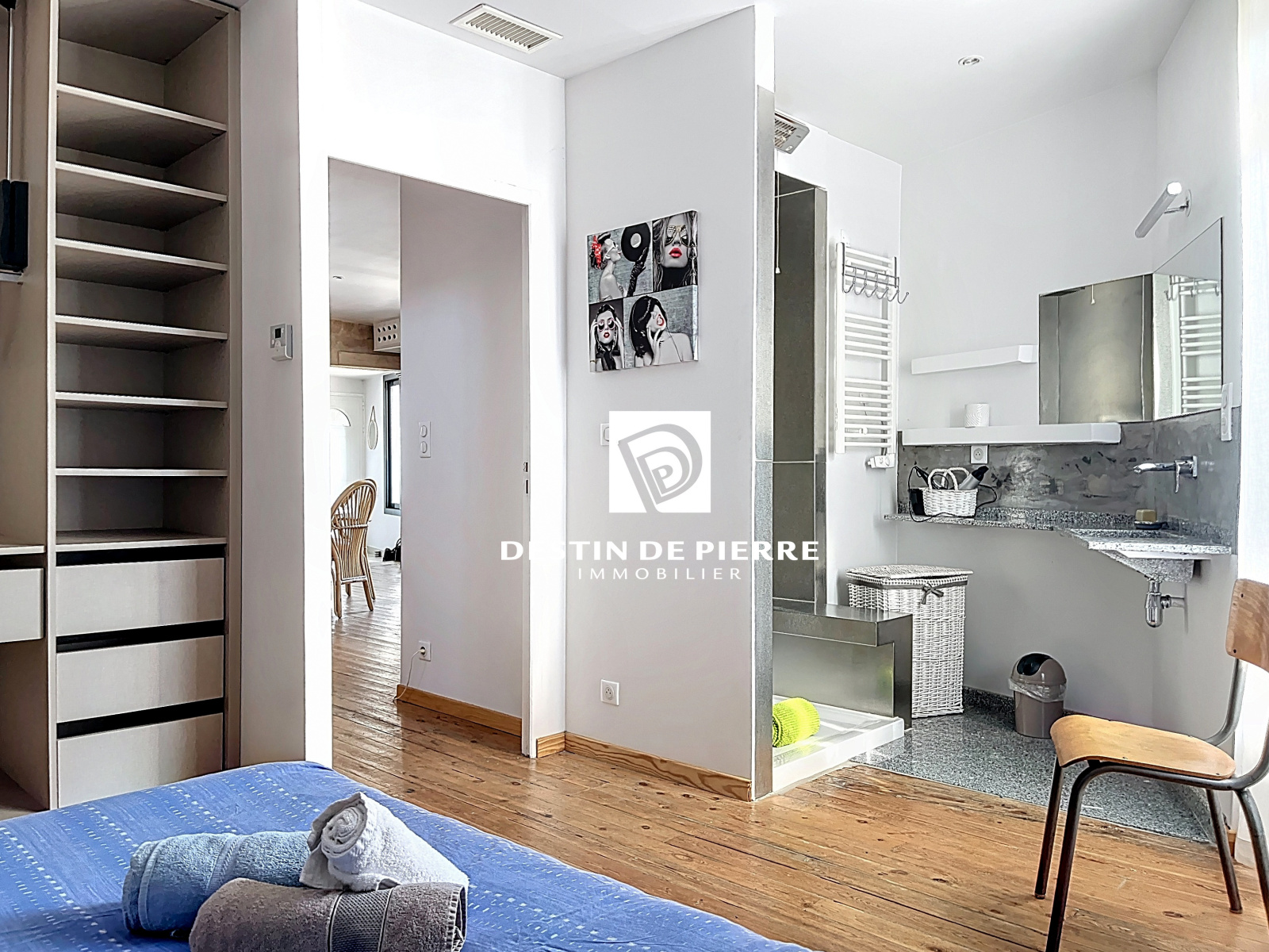 - Une chambre avec sa salle d’eau privative, espace dressing avec étagères intégrées, et un plan de salle d'eau entièrement réalisé en granit pleine masse et douche en inox