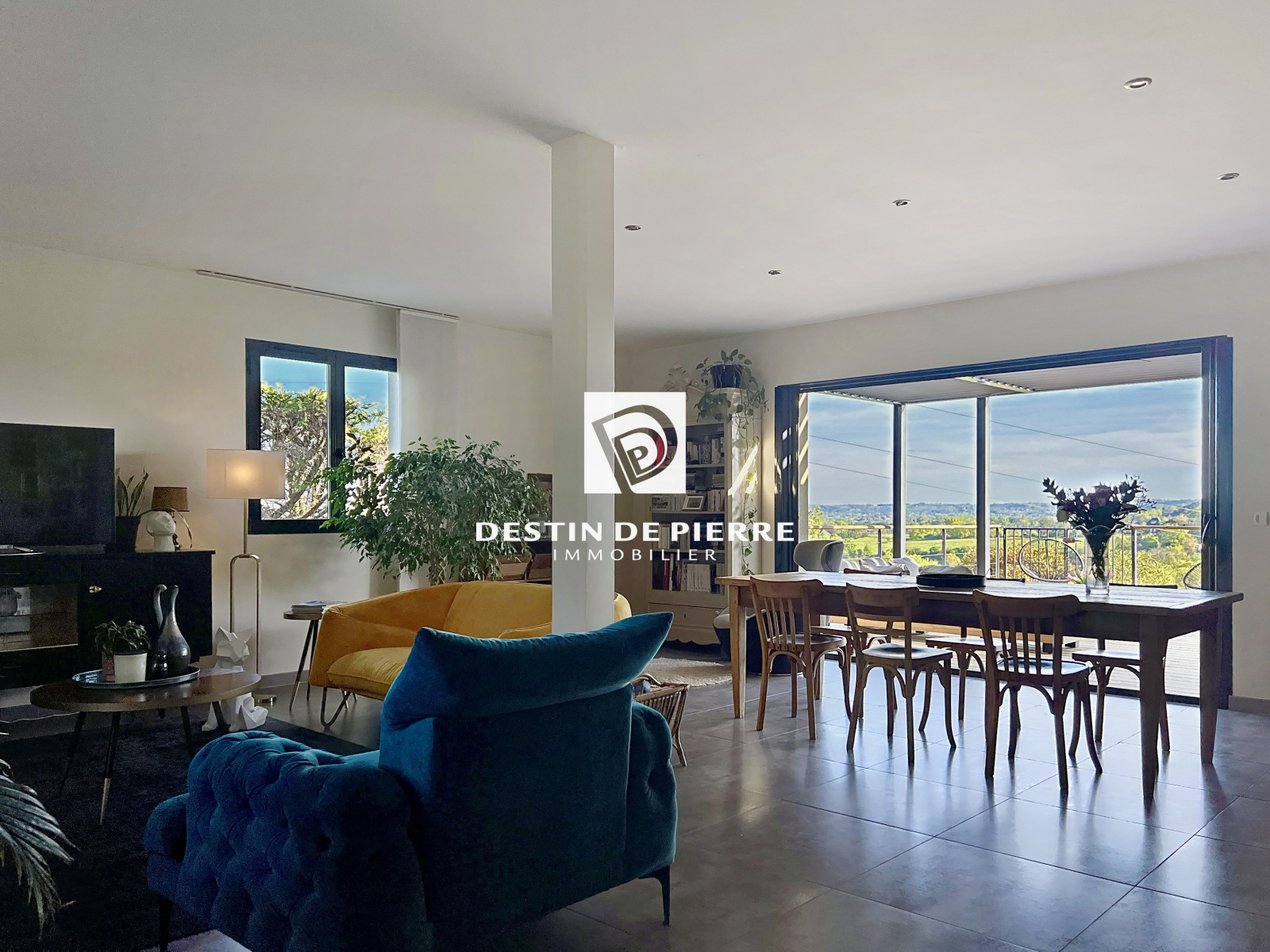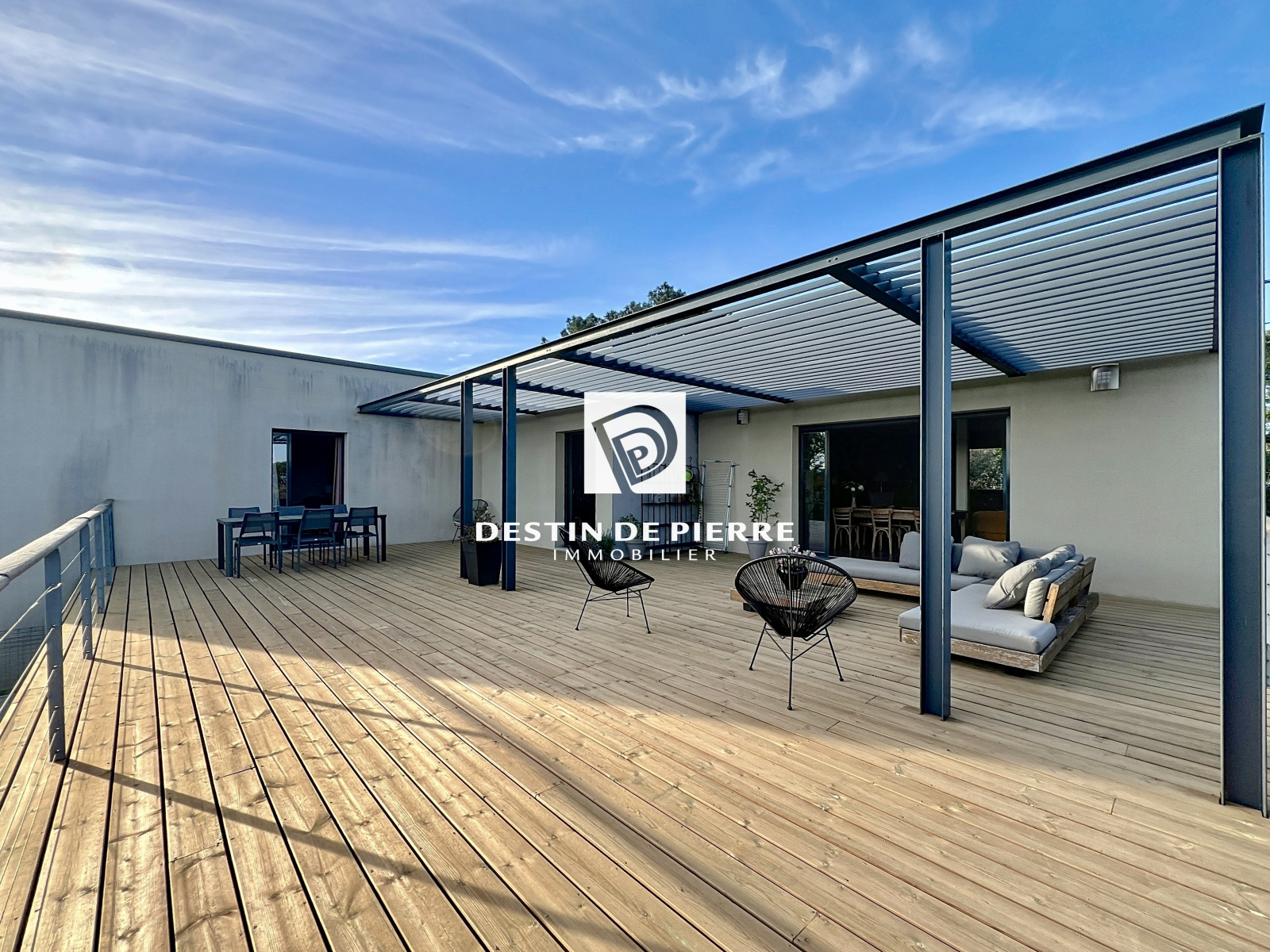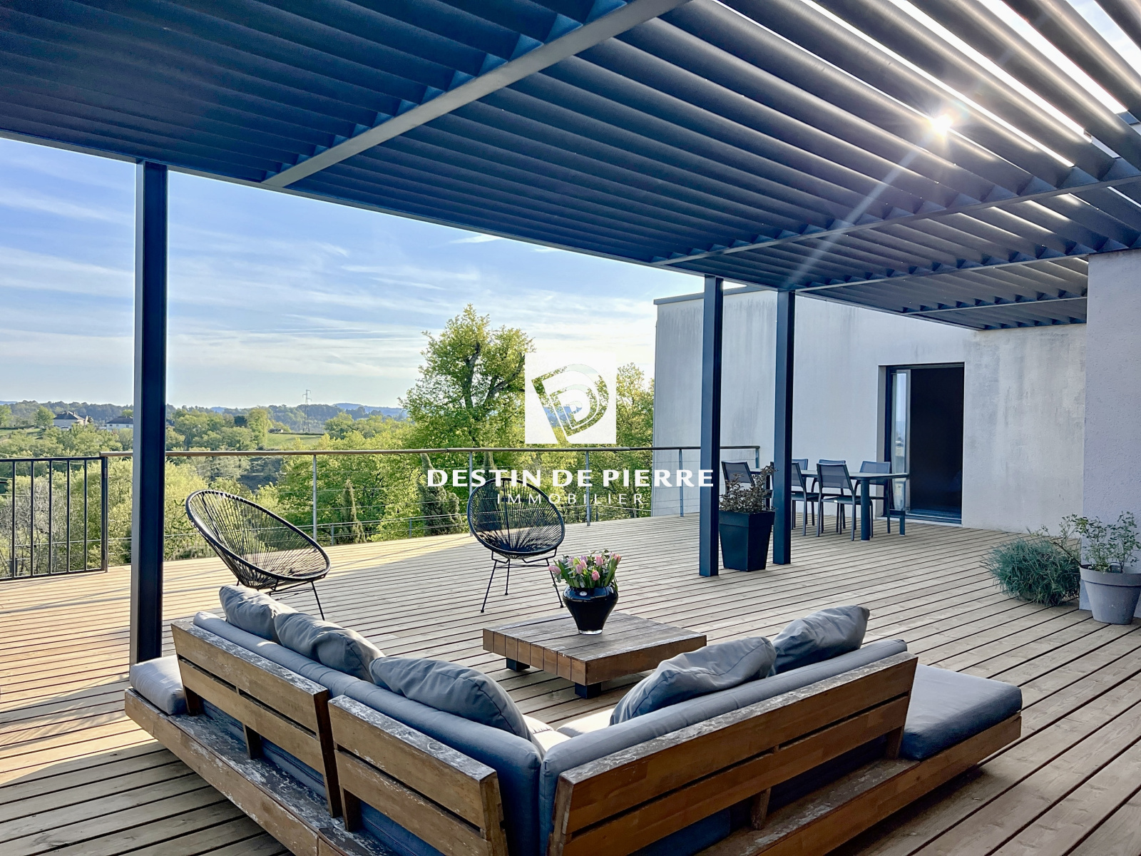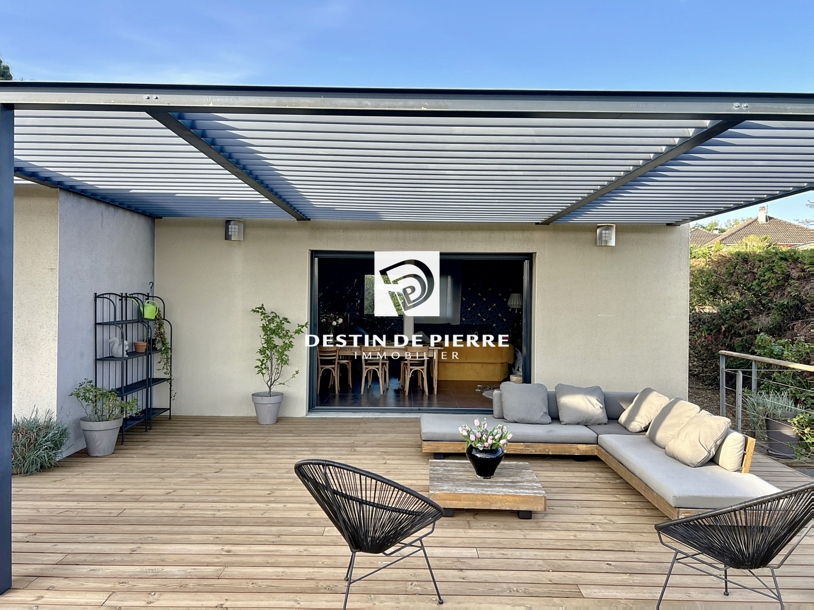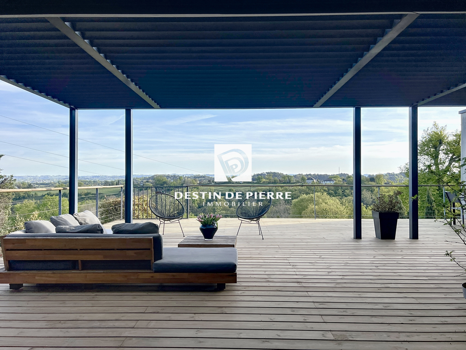 Édifiée sur un terrain en pente douce, cette maison à l’architecture moderne, proposant 180 m² habitables, séduit dès l’entrée par ses volumes ouverts et sa luminosité. Le vaste salon/séjour, baigné de lumière grâce à ses baies vitrées à galandage, s’ouvre sur une grande terrasse en bois de 82 m², partiellement ombragée par une élégante pergola en brise-soleil aluminium de 45 m², offrant un prolongement idéal des espaces de vie intérieurs vers l’extérieur afin de profiter de la vue dégagée qui change au fil des saisons.
