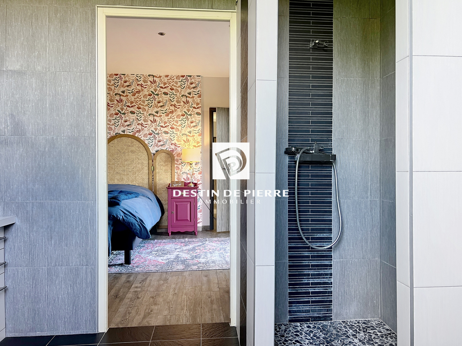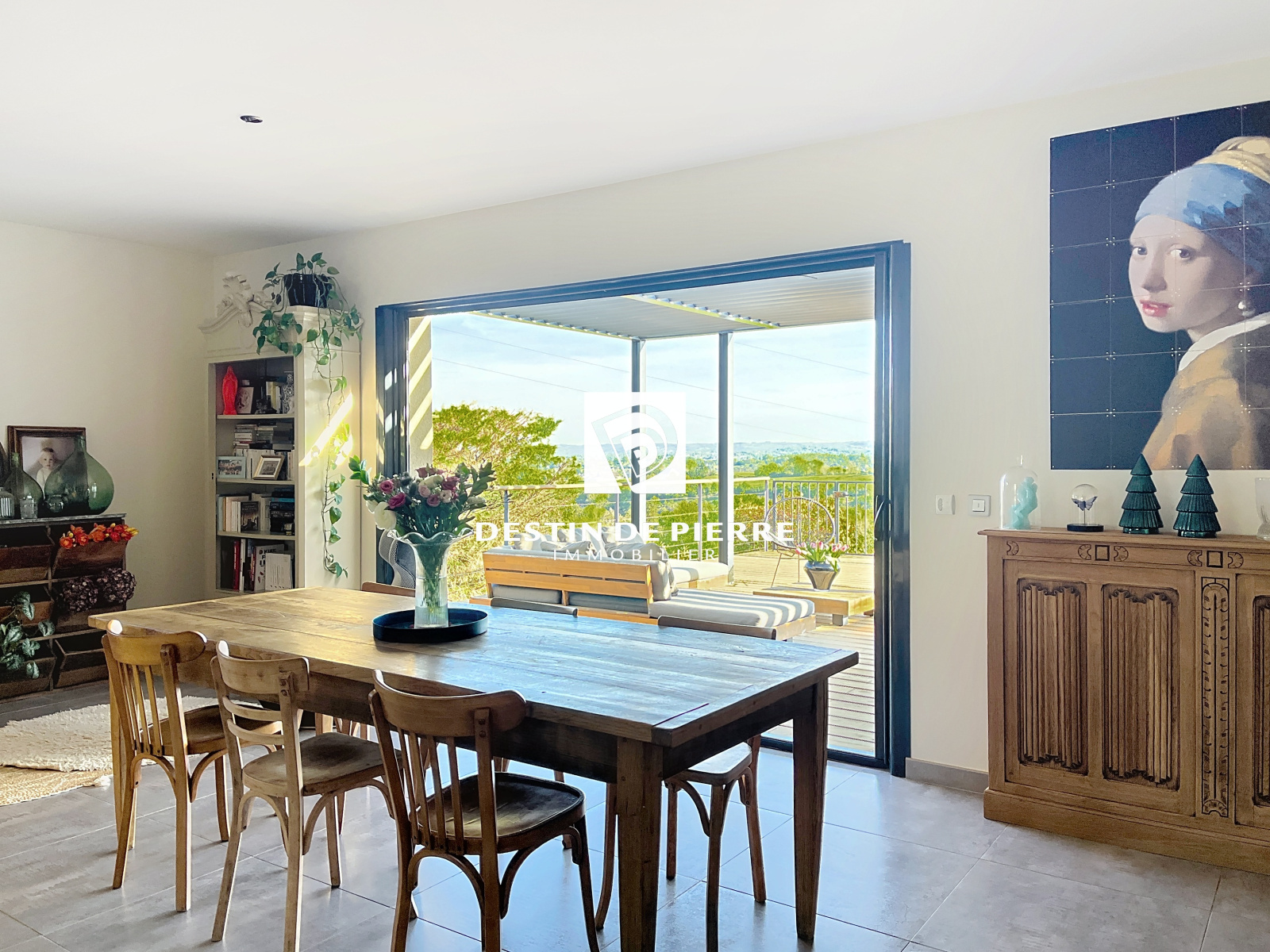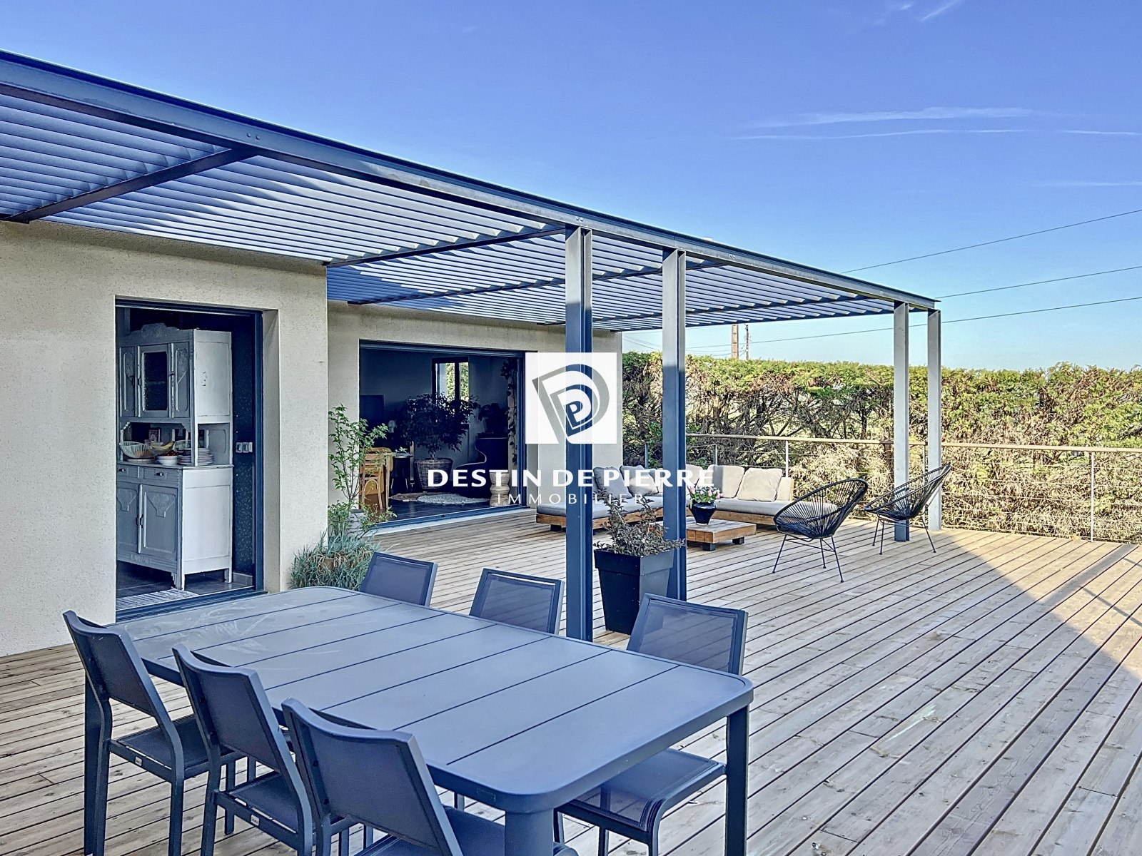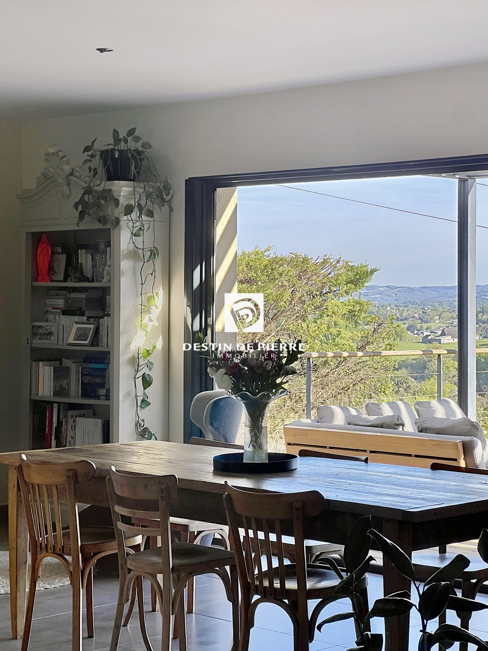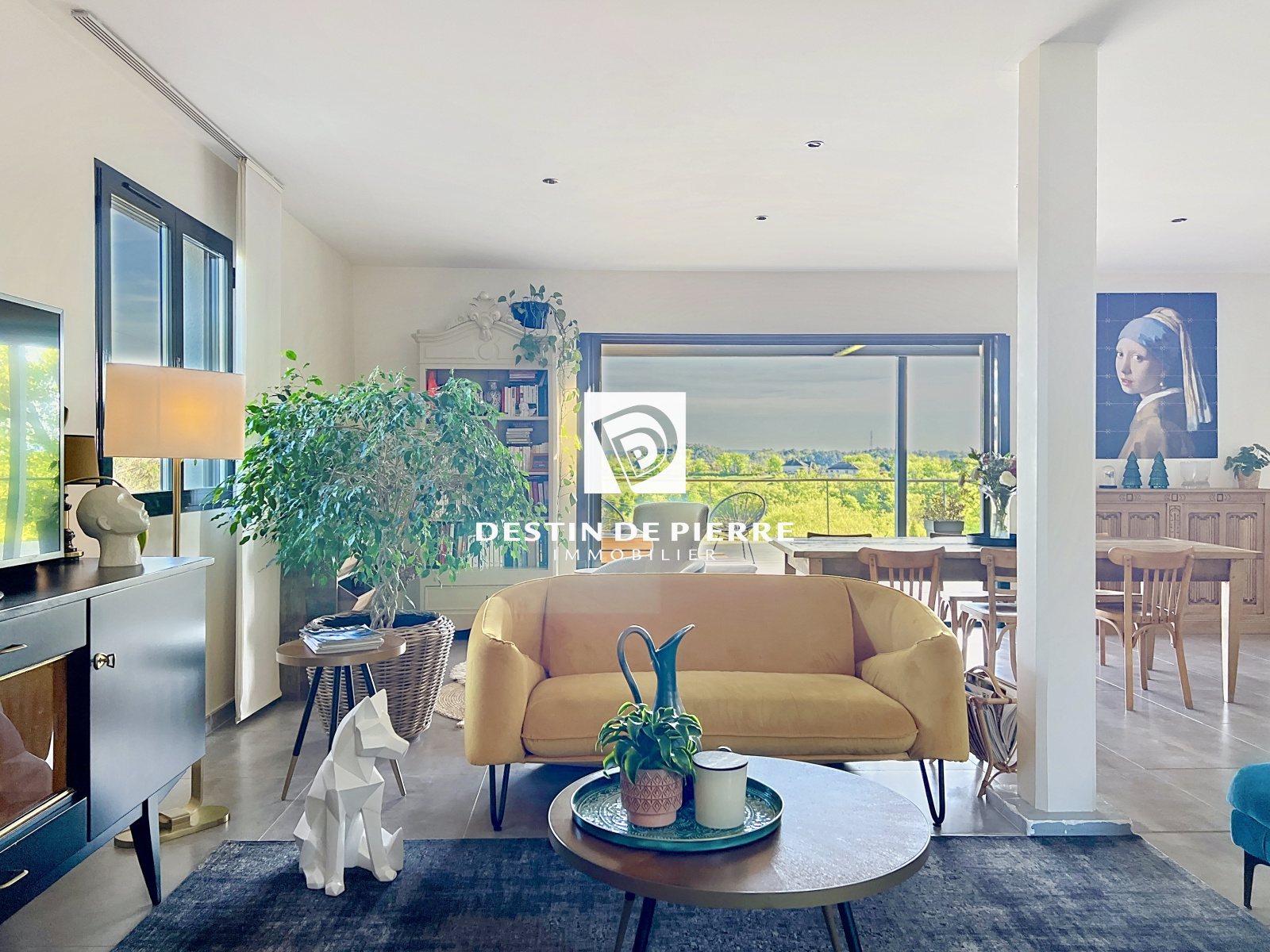 Édifiée sur un terrain en pente douce, cette maison à l’architecture moderne, proposant 180 m² habitables, séduit dès l’entrée par ses volumes ouverts et sa luminosité. Le vaste salon/séjour, baigné de lumière grâce à ses baies vitrées à galandage, s’ouvre sur une grande terrasse en bois de 82 m², partiellement ombragée par une élégante pergola en brise-soleil aluminium de 45 m², offrant un prolongement idéal des espaces de vie intérieurs vers l’extérieur afin de profiter de la vue dégagée qui change au fil des saisons.