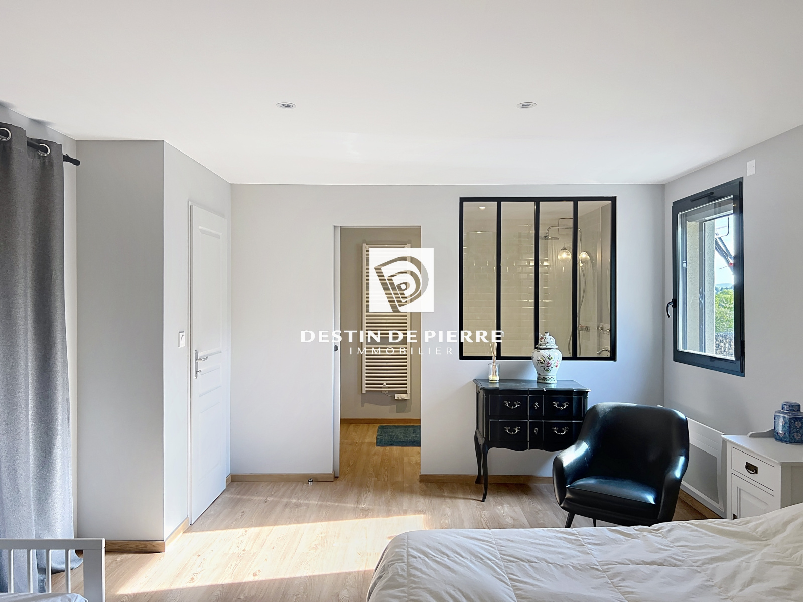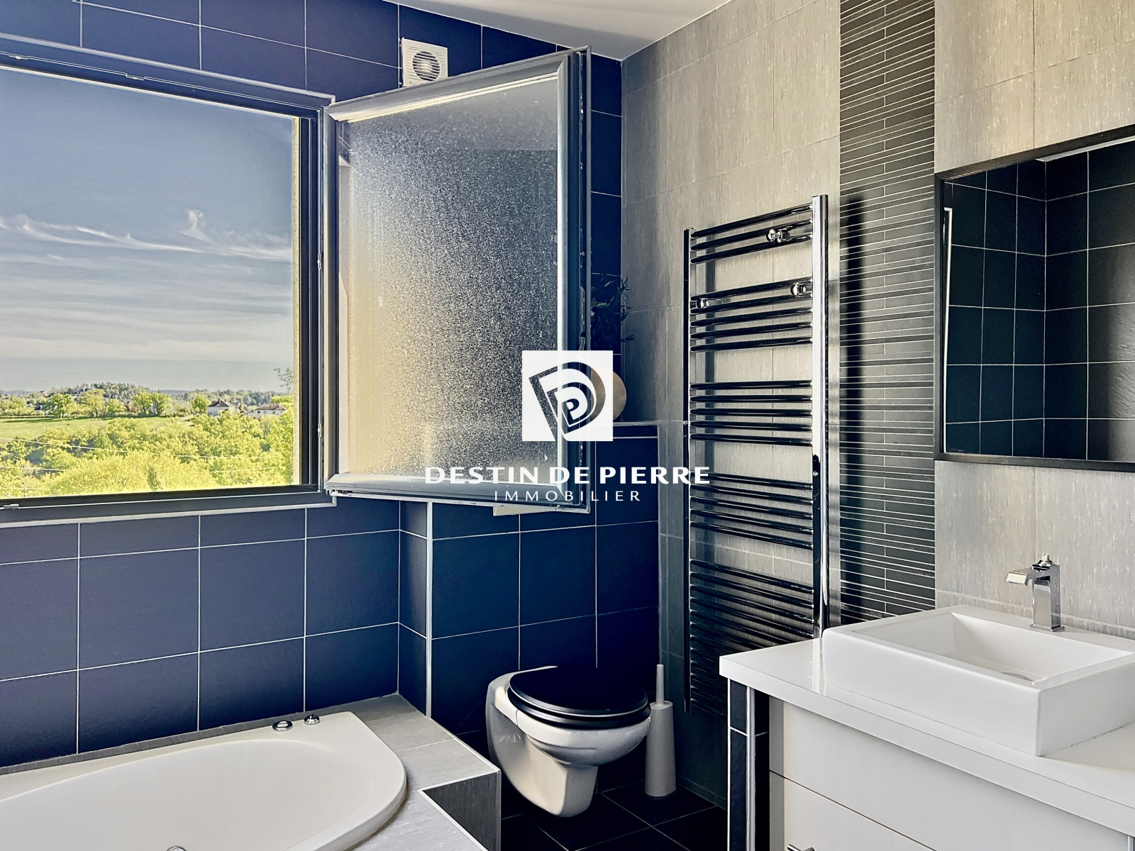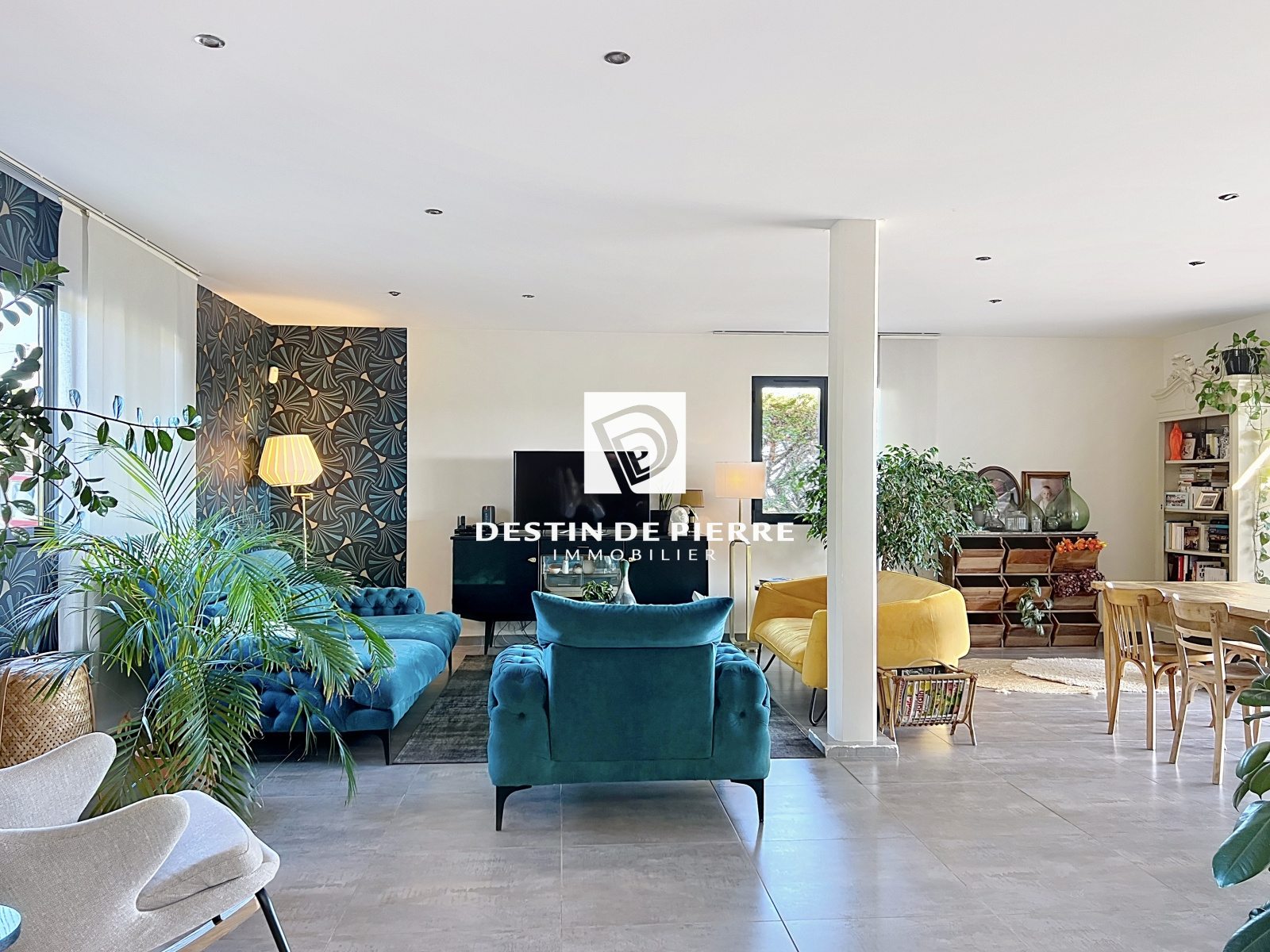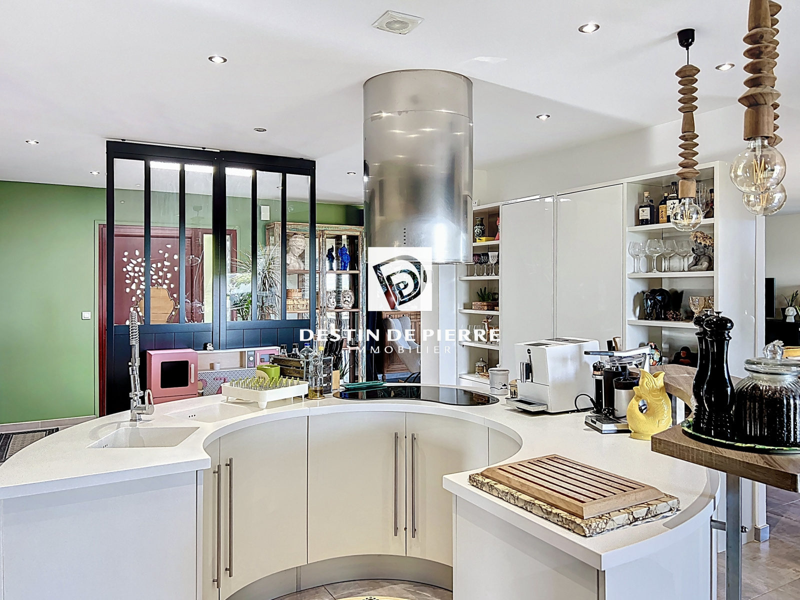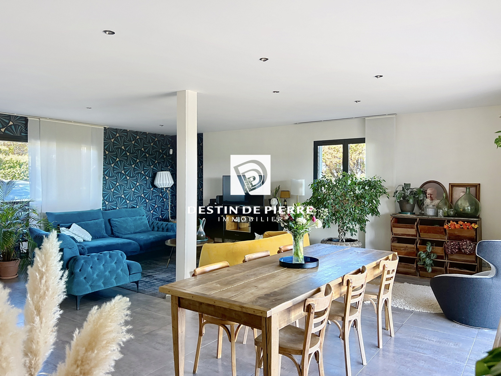 Édifiée sur un terrain en pente douce, cette maison à l’architecture moderne, proposant 180 m² habitables, séduit dès l’entrée par ses volumes ouverts et sa luminosité. Le vaste salon/séjour, baigné de lumière grâce à ses baies vitrées à galandage, s’ouvre sur une grande terrasse en bois de 82 m², partiellement ombragée par une élégante pergola en brise-soleil aluminium de 45 m², offrant un prolongement idéal des espaces de vie intérieurs vers l’extérieur afin de profiter de la vue dégagée qui change au fil des saisons.