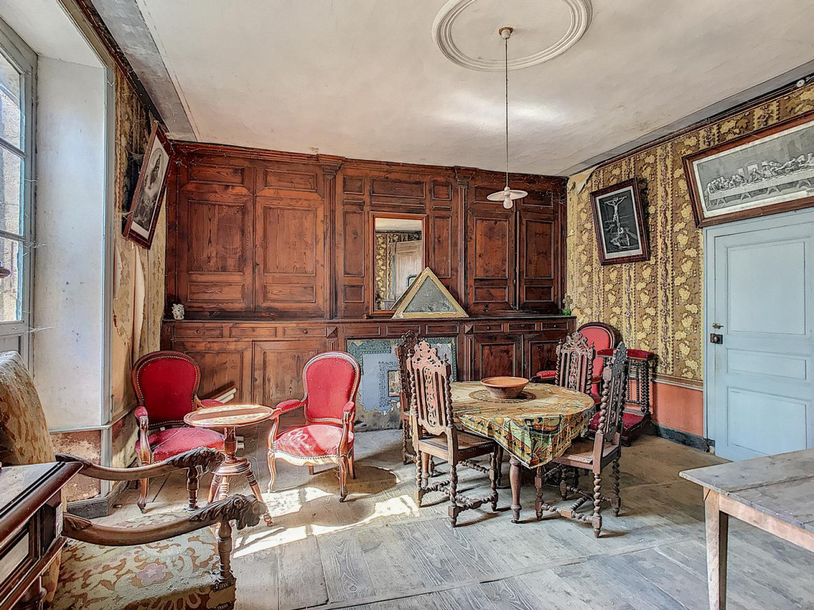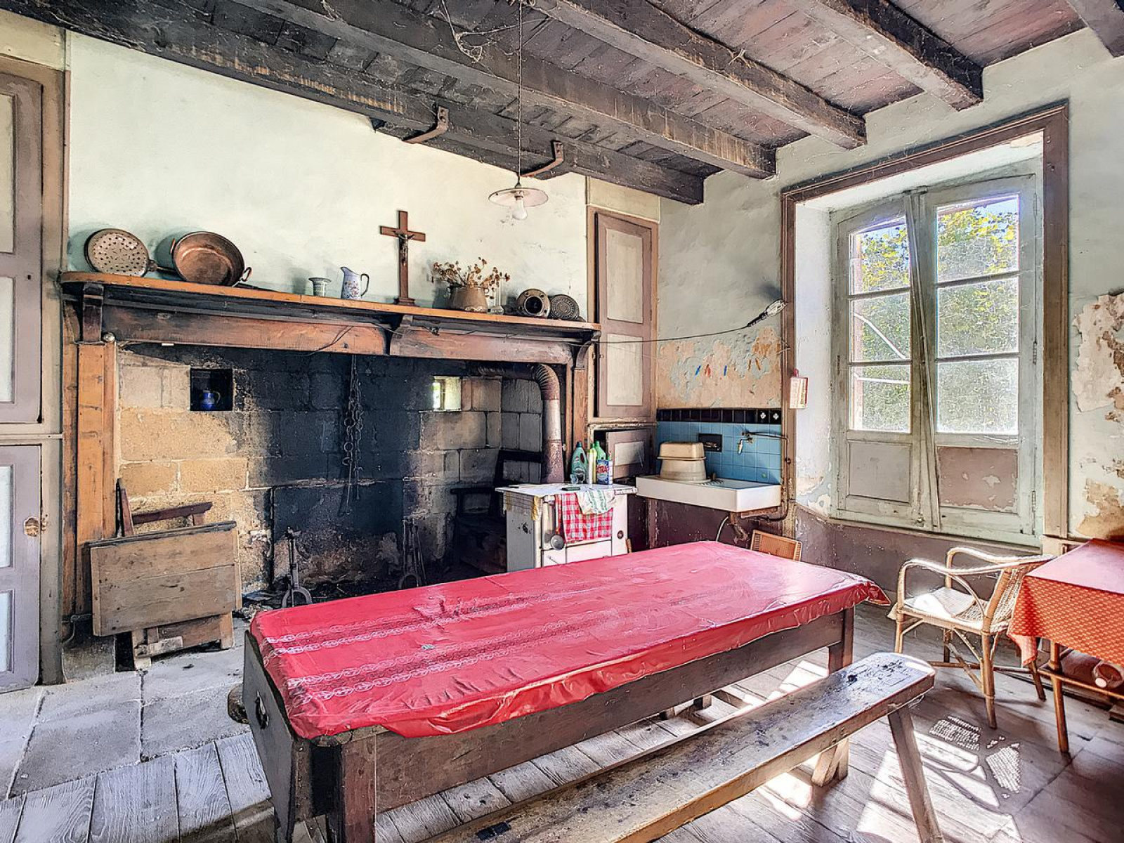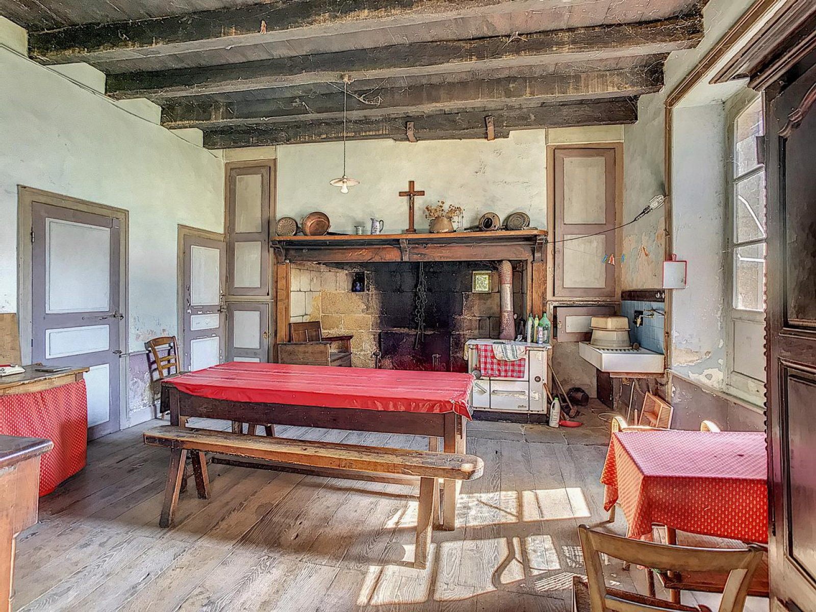 Le rez-de-chaussée : Ce niveau est constitué d'un grand salon orné de splendides boiseries sculptées entourant la cheminée et d'un magnifique parquet échelle en chêne, d'une spacieuse cuisine avec un ancien cantou, d'une arrière cuisine et de deux chambres.