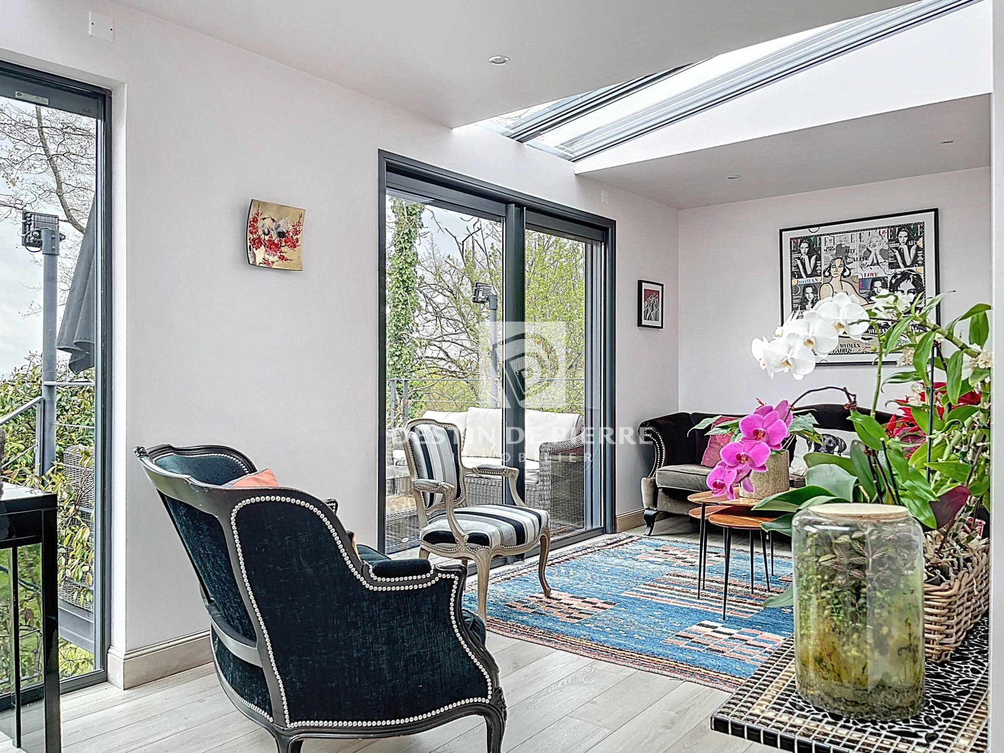 Au niveau principal, vous découvrirez une magnifique pièce de vie lumineuse avec cheminée, idéale pour des moments conviviaux. Celle-ci s’ouvre sur une véranda, elle-même prolongée par une terrasse extérieure avec accès direct au jardin par un escalier.