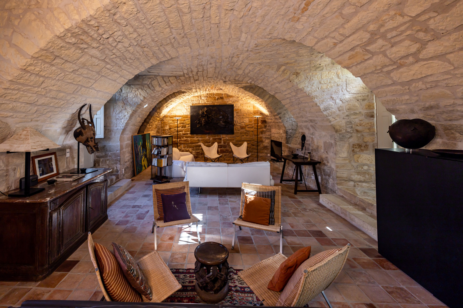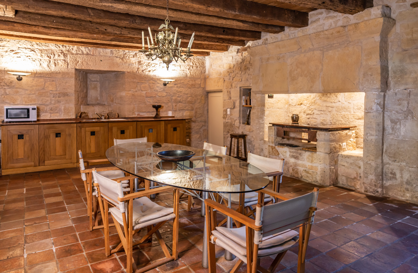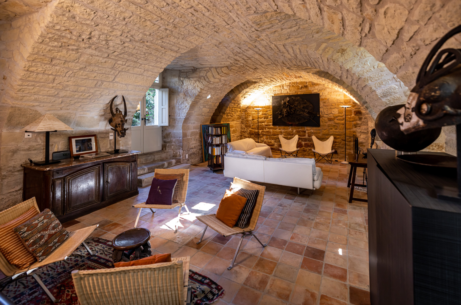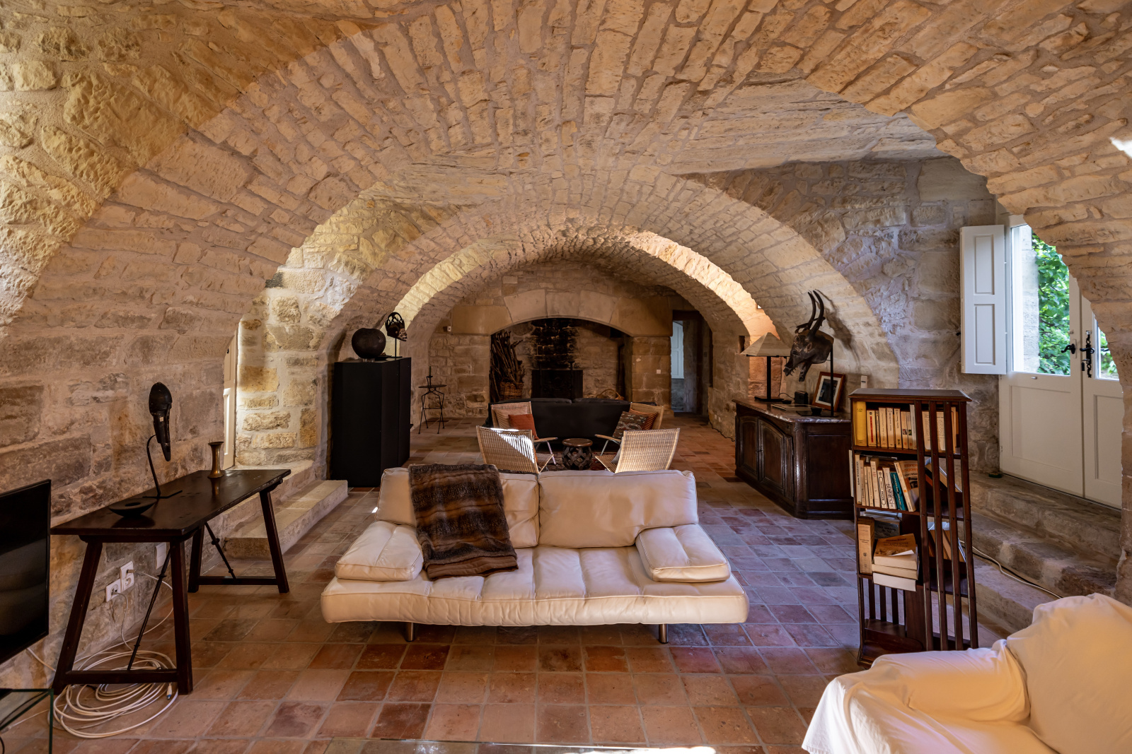 Le rez-de-jardin se compose de deux grandes salles. L'une voûtée, en pierre blanche, fait office de salon. Elle arbore une grande cheminée et ouvre, d'un côté sur la cour d'entrée, et de l'autre, sur le jardin. La seconde, également traversante, aux poutres massives d'aspect rustique, a été aménagée en cuisine dînatoire.