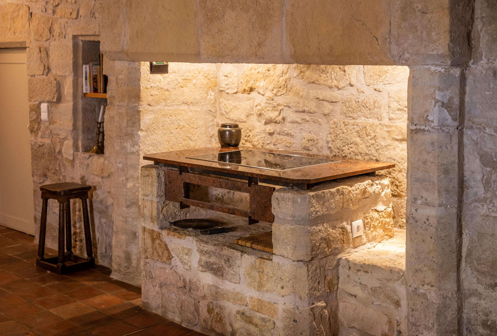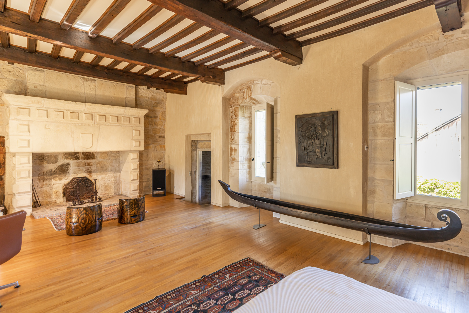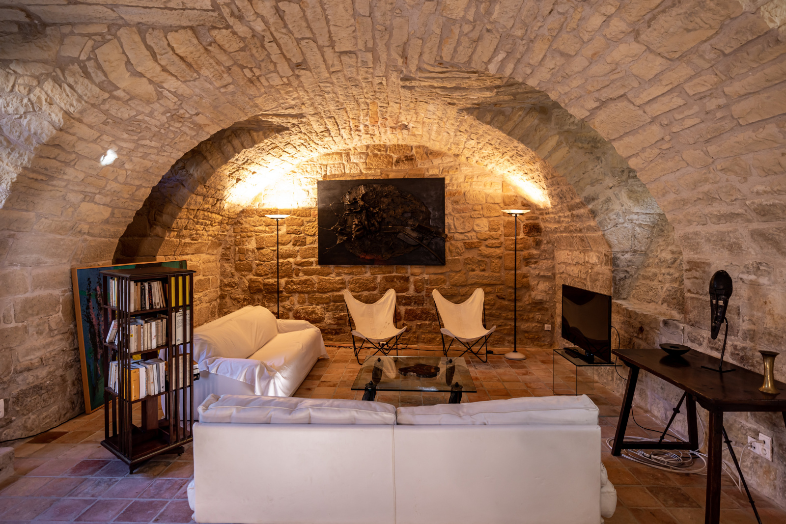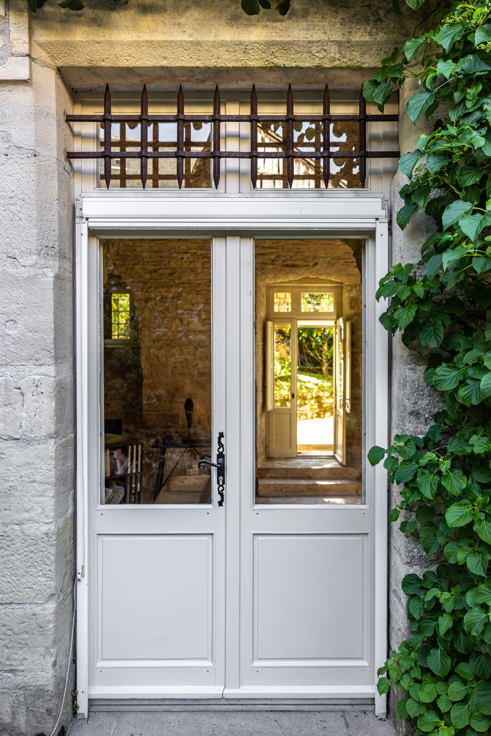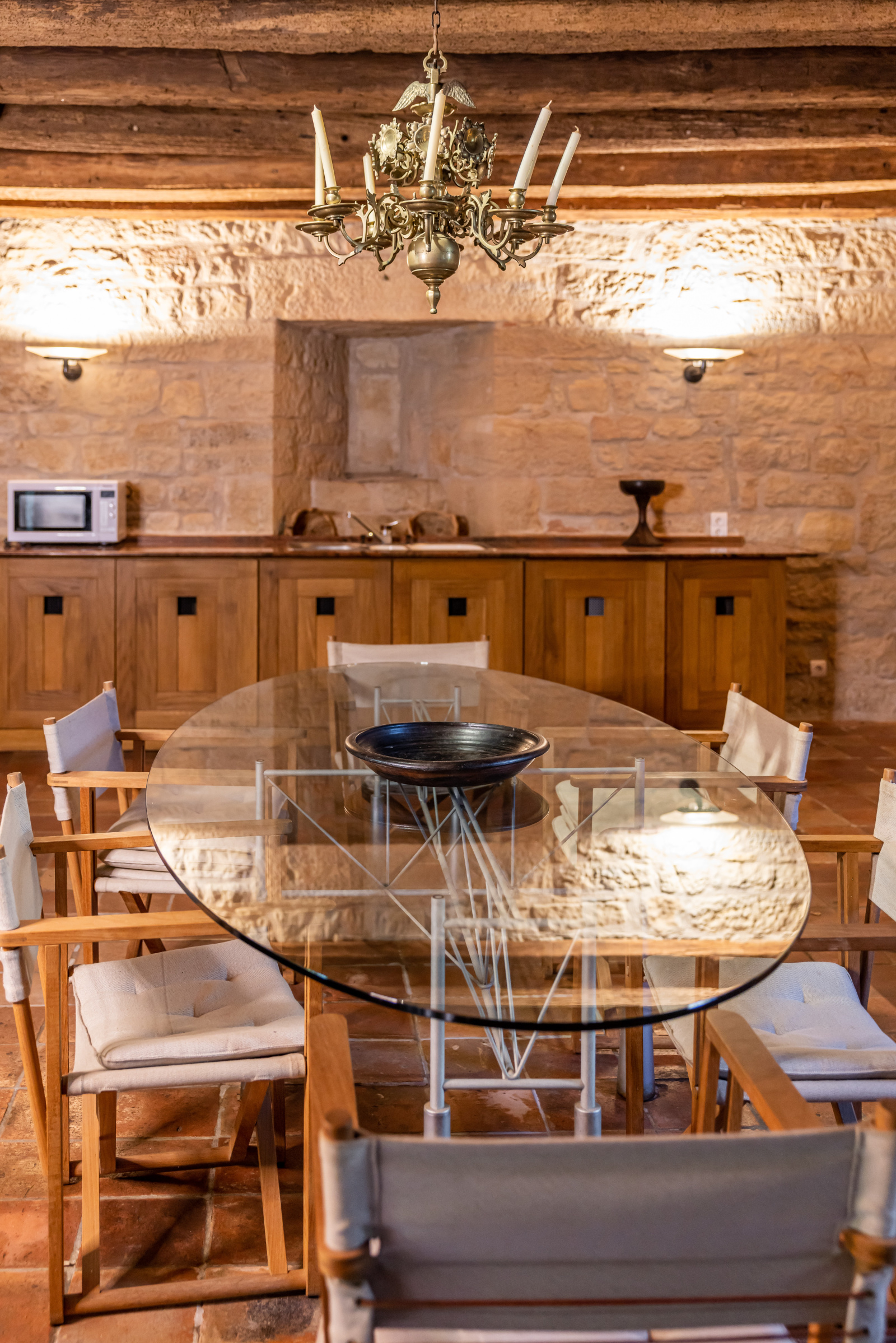 Le rez-de-jardin se compose de deux grandes salles. L'une voûtée, en pierre blanche, fait office de salon. Elle arbore une grande cheminée et ouvre, d'un côté sur la cour d'entrée, et de l'autre, sur le jardin. La seconde, également traversante, aux poutres massives d'aspect rustique, a été aménagée en cuisine dînatoire.