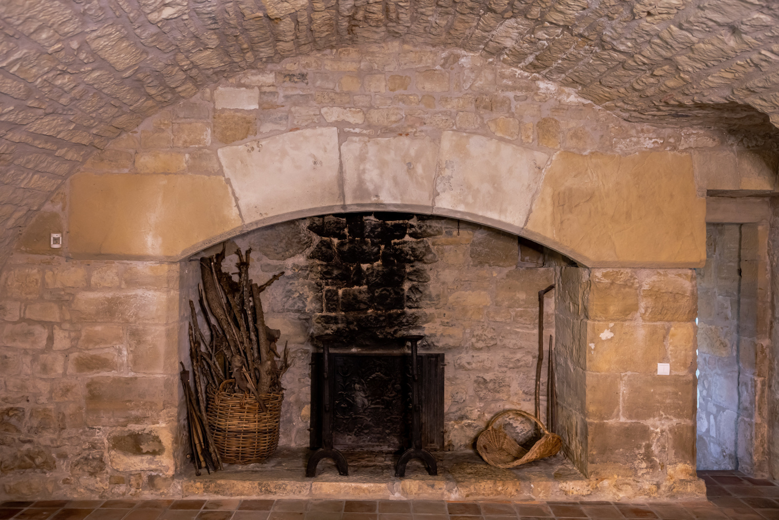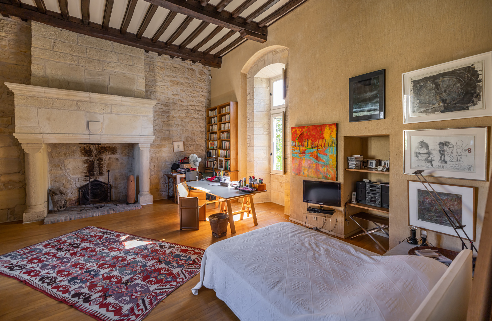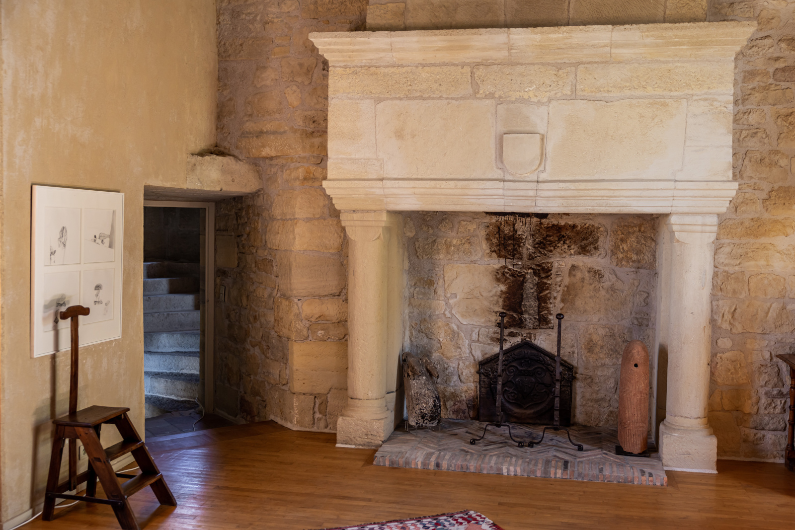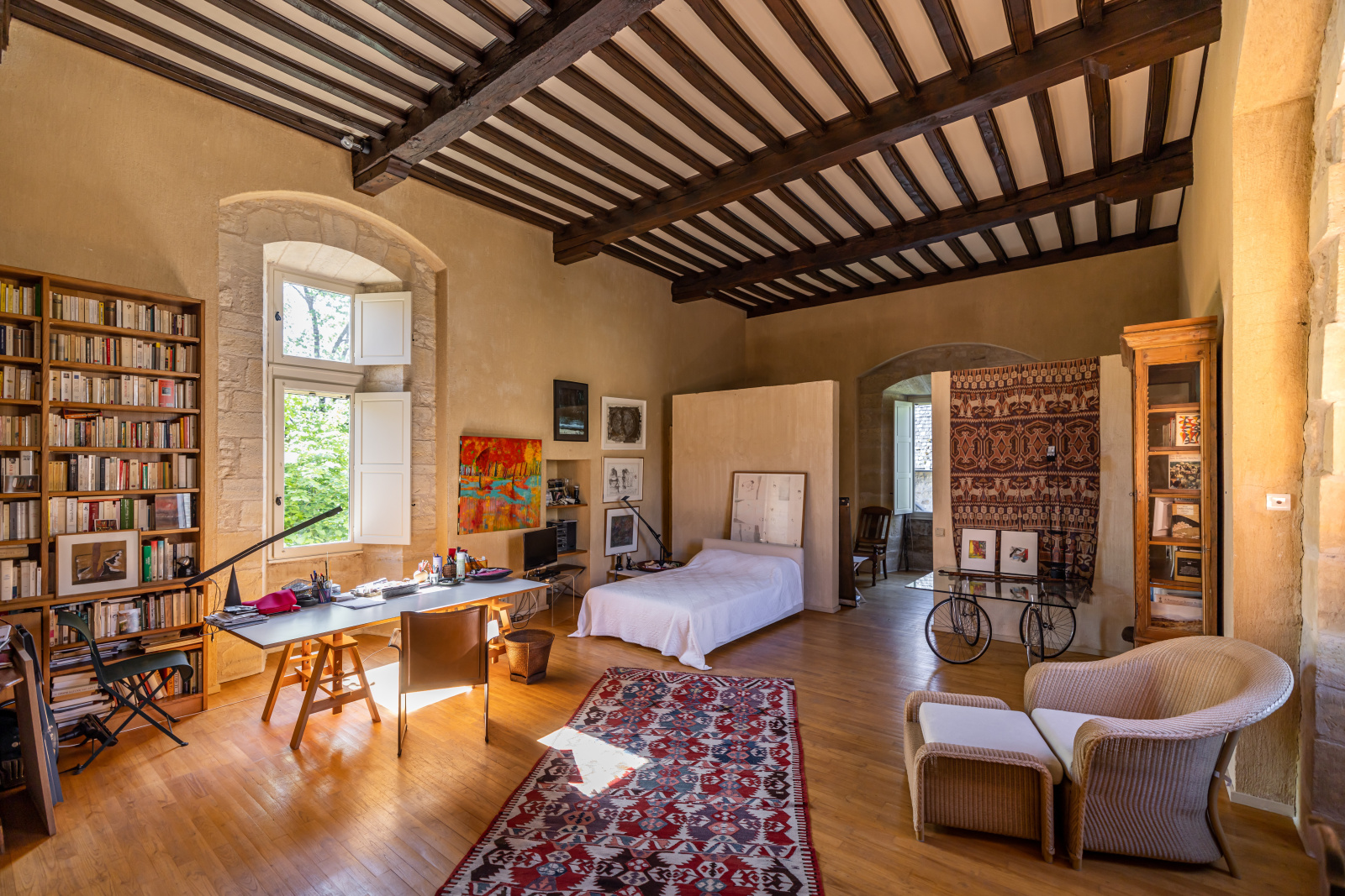 Le rez-de-jardin se compose de deux grandes salles. L'une voûtée, en pierre blanche, fait office de salon. Elle arbore une grande cheminée et ouvre, d'un côté sur la cour d'entrée, et de l'autre, sur le jardin. La seconde, également traversante, aux poutres massives d'aspect rustique, a été aménagée en cuisine dînatoire.