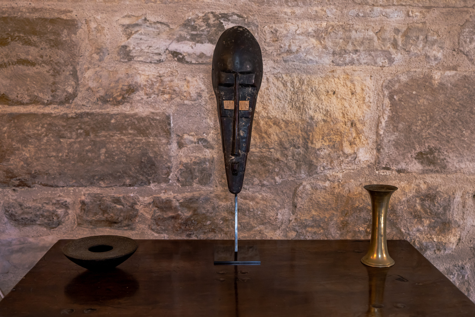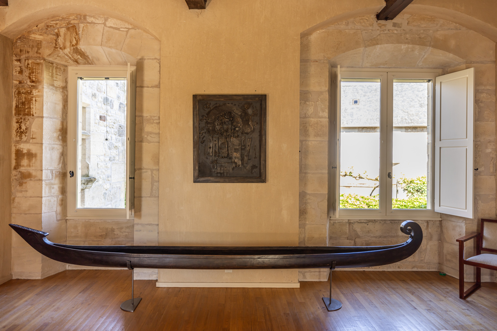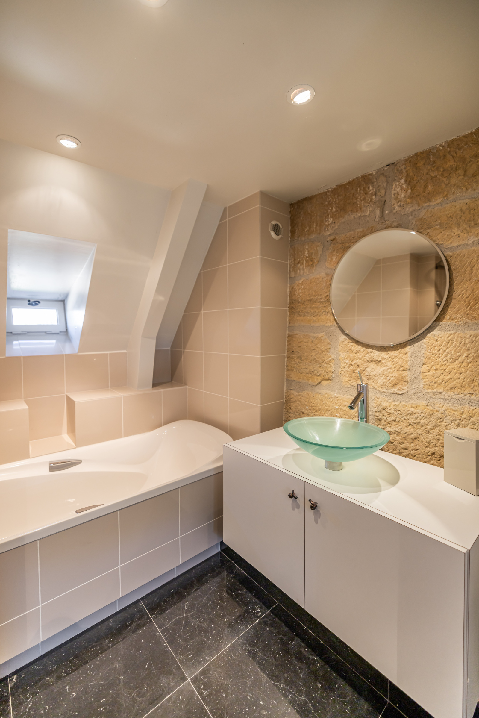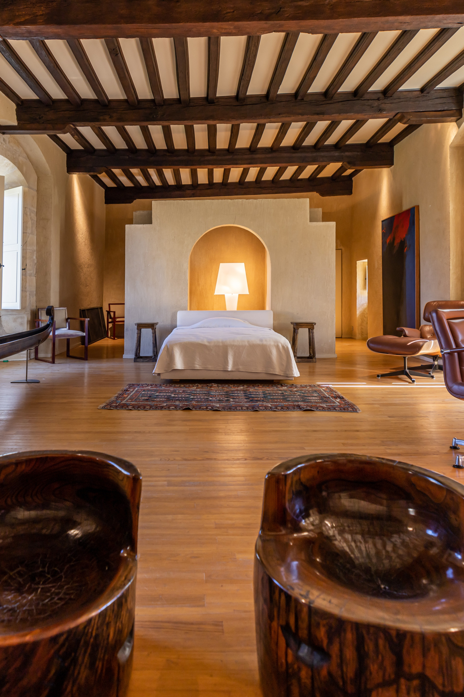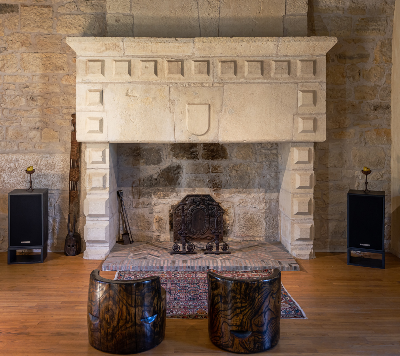 Le rez-de-jardin se compose de deux grandes salles. L'une voûtée, en pierre blanche, fait office de salon. Elle arbore une grande cheminée et ouvre, d'un côté sur la cour d'entrée, et de l'autre, sur le jardin. La seconde, également traversante, aux poutres massives d'aspect rustique, a été aménagée en cuisine dînatoire.