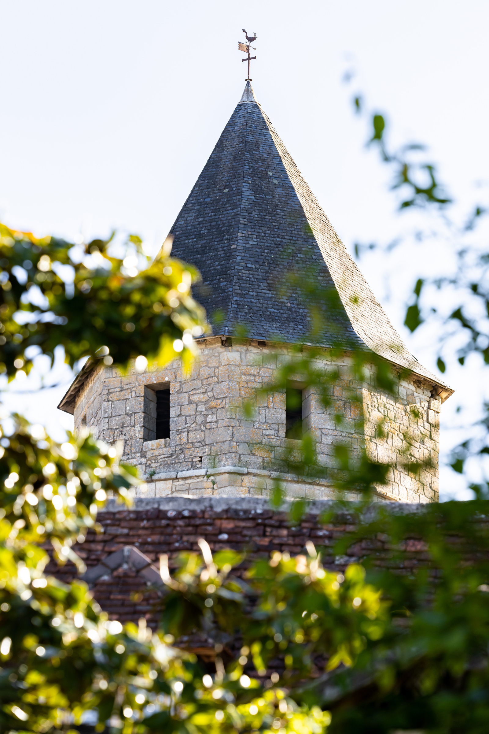 L'entrée dans la maison se fait au pied de la tour carrée, coiffée d'une toiture quatre pans à coyaux. Elément architectural remarquable, elle accueille en son sein l'escalier à vis en pierre. Alors que l'extérieur est de forme carrée, son intérieur est circulaire.