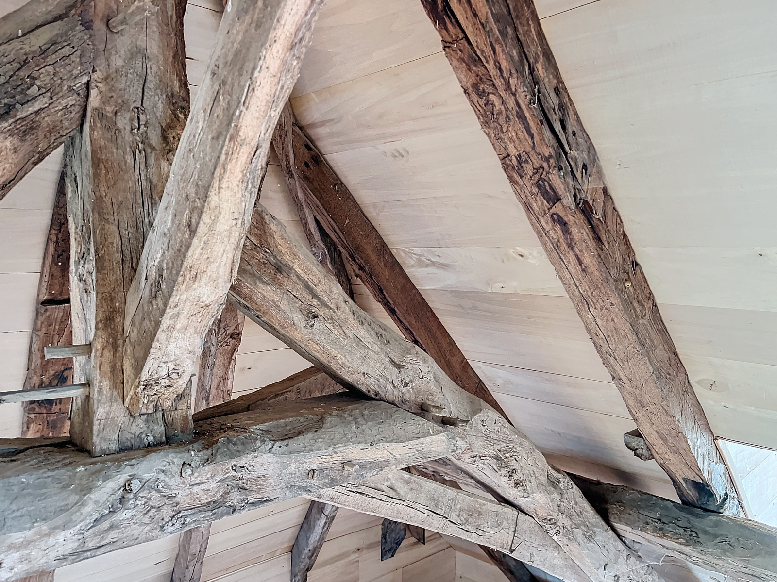 Grand salon lumineux aux poutraisons anciennes totalement apparentes avec un entre-poutres en volige de peuplier. Cet effet des plus remarquables a été permis par l'astucieuse création d'une surtoiture (lsolation en panneaux de laine de bois avec couverture en tuiles plates terre cuite).