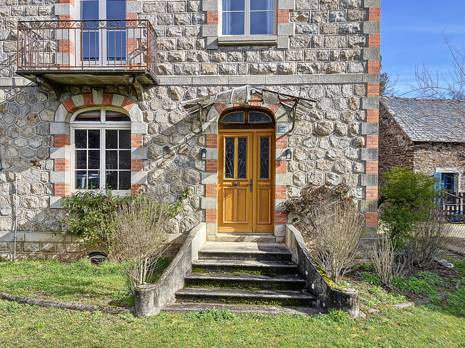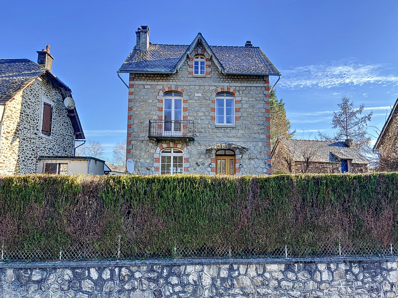 Architecture typique du début du XXème siècle (Murs en pierre recouverts d'enduit, encadrements de portes et fenêtres en pierres de taille et briquettes, charpente traditionnelle couverte en ardoise de pays).