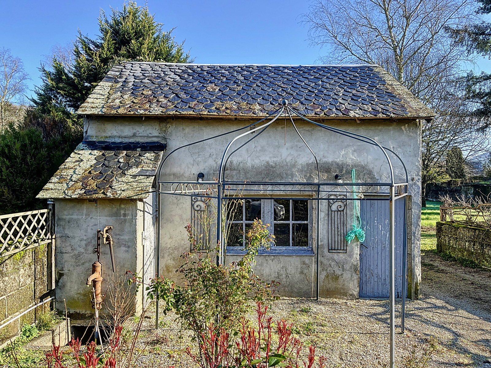 Parc arboré et aménagé : espace barbecue couvert, atelier, garage ouvert, bassin de jardin.