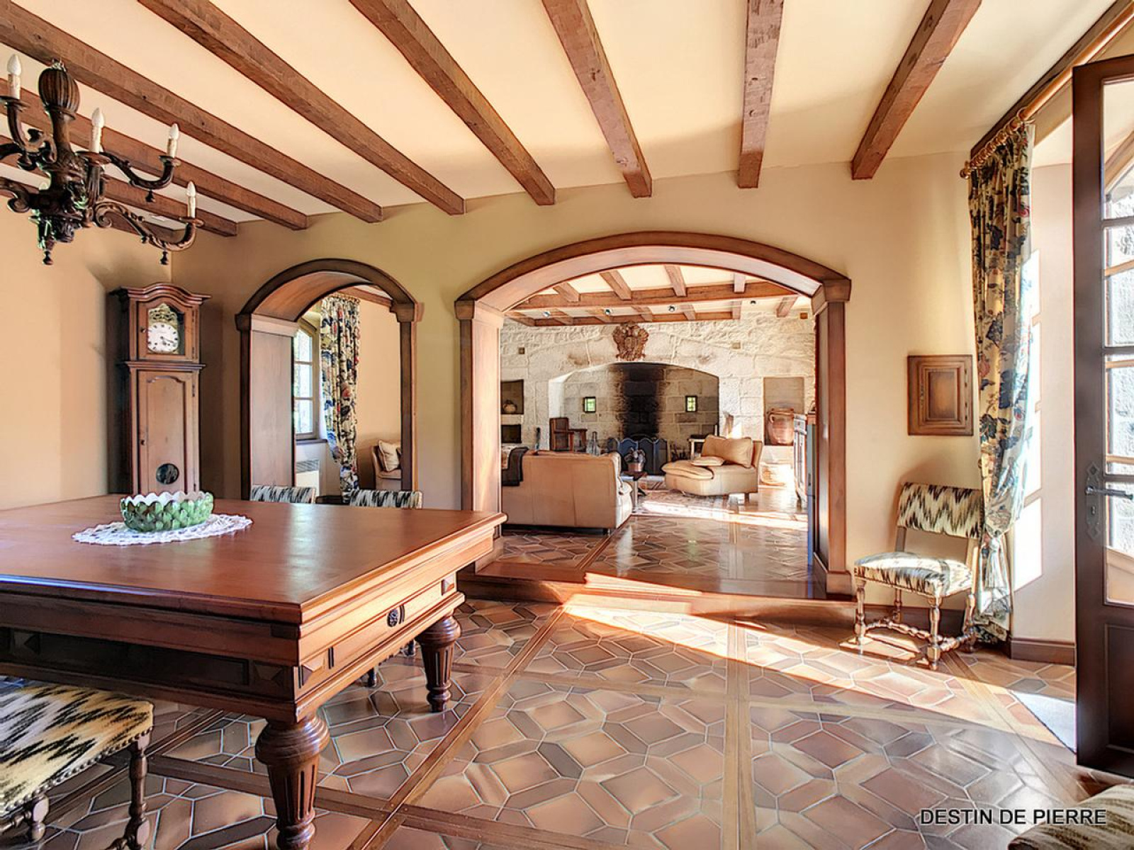 - une grande pièce de vie de 60 m² ouvrant sur la terrasse. Cette pièce propose un espace salle à manger et un espace salon avec son cantou, très grande cheminée en pierres taillées.