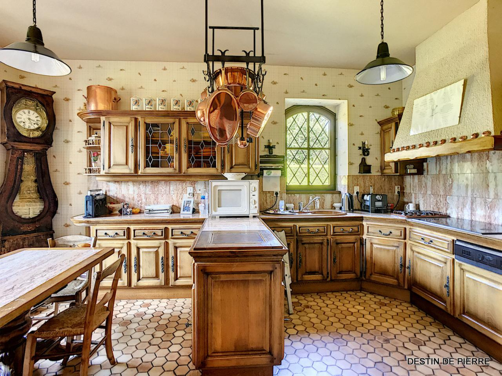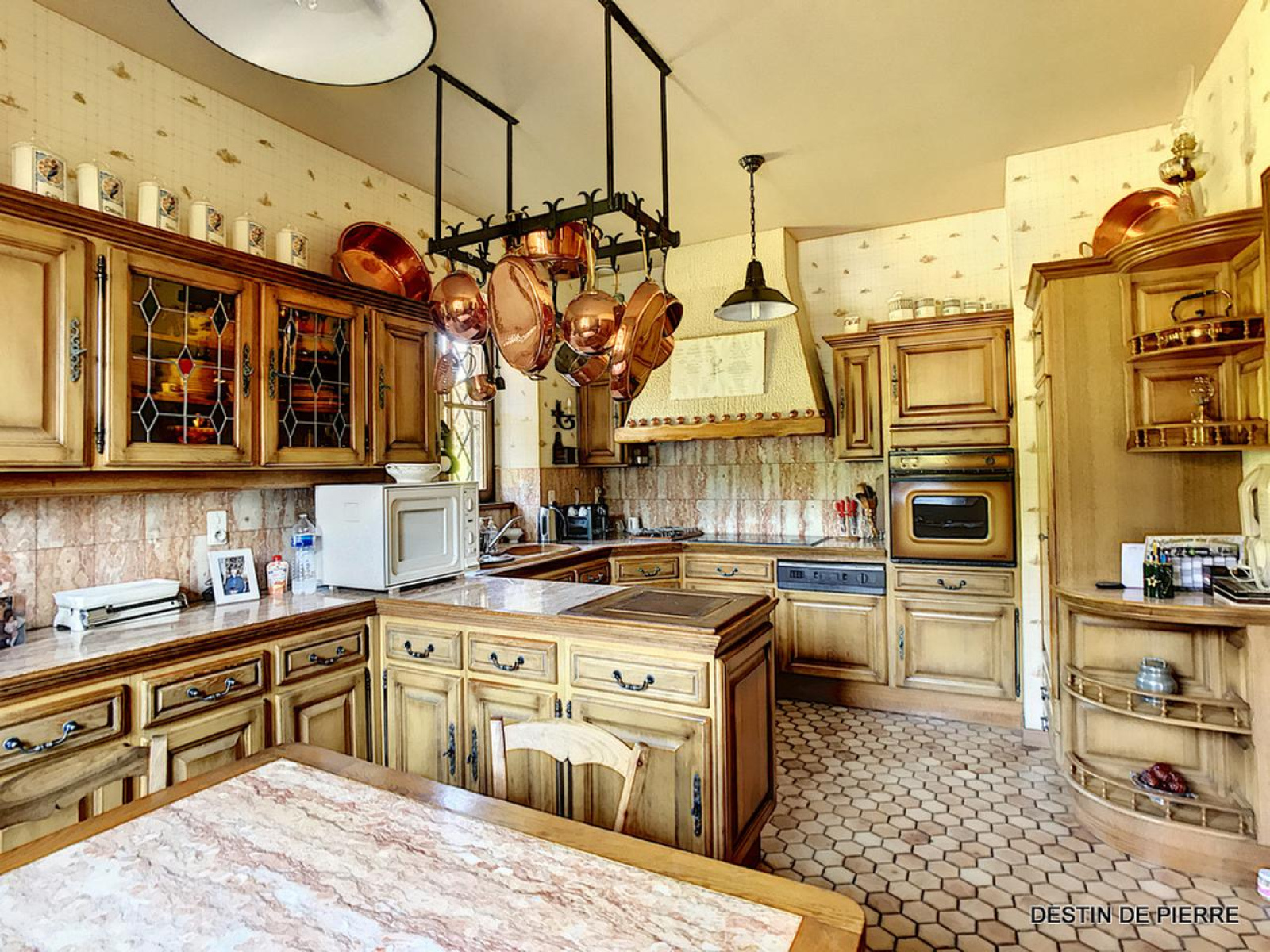 - une cuisine en chêne massif entièrement équipée et aménagée (four, plaque gaz et plaque vitrocéramique, réfrigérateur, hotte aspirante et lave-vaisselle).
