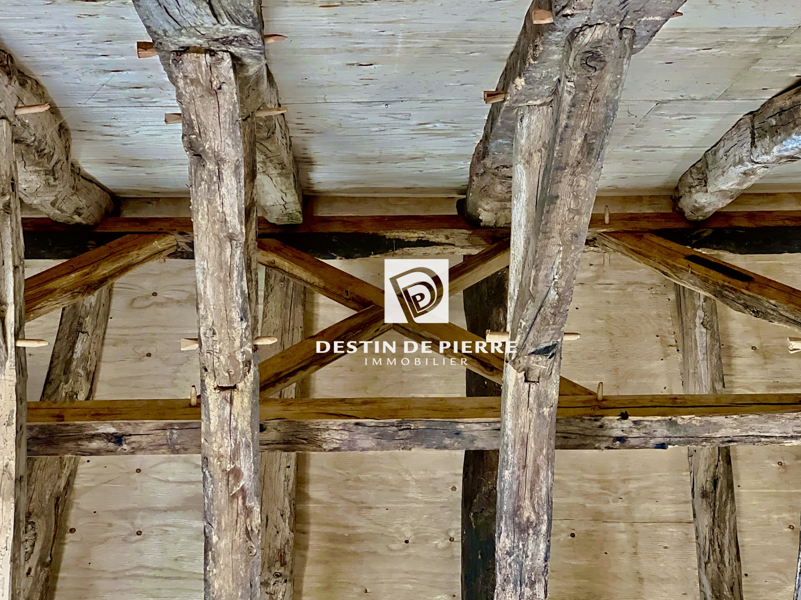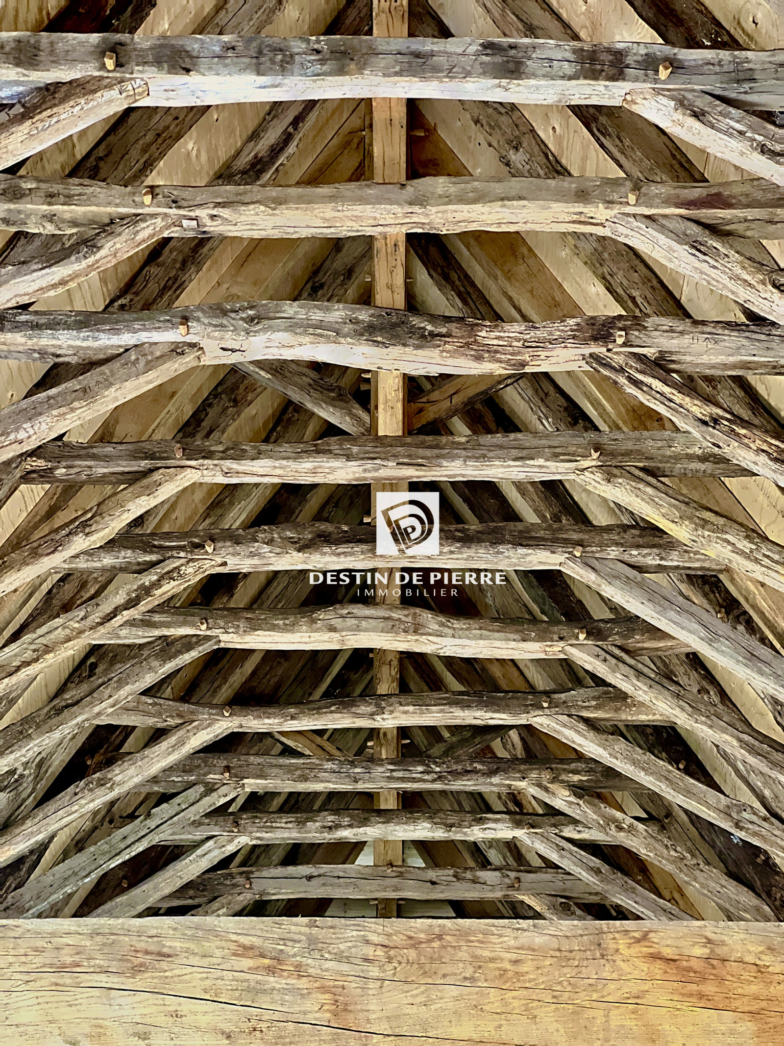 La pièce de vie : une vaste pièce d’environ 80 m2 au sol, arbore une charpente apparente assemblée par chevillage traditionnel et deux cheminées anciennes. La très belle hauteur sous plafond permettrait, si souhaité, une surélévation partielle pour création d’un niveau supplémentaire.