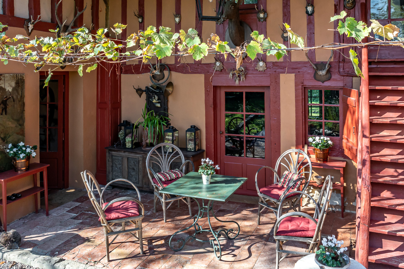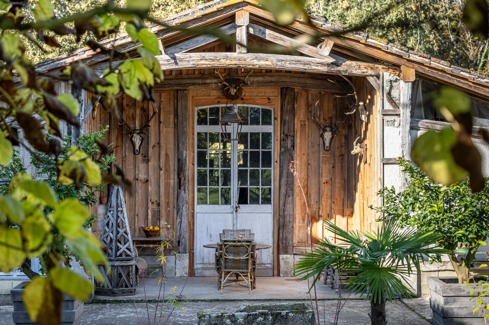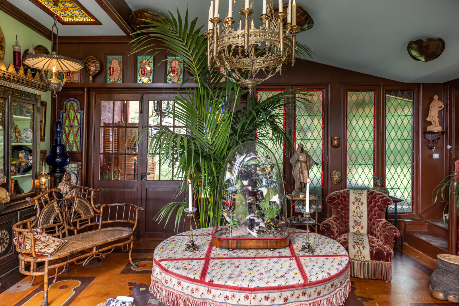 Un jardin d'hiver très XIXème, aménagé dans un style cabinet de curiosités, ouvre d'un côté sur le jardin et de l'autre sur une terrasse couverte constituant une extension de ce salon.
