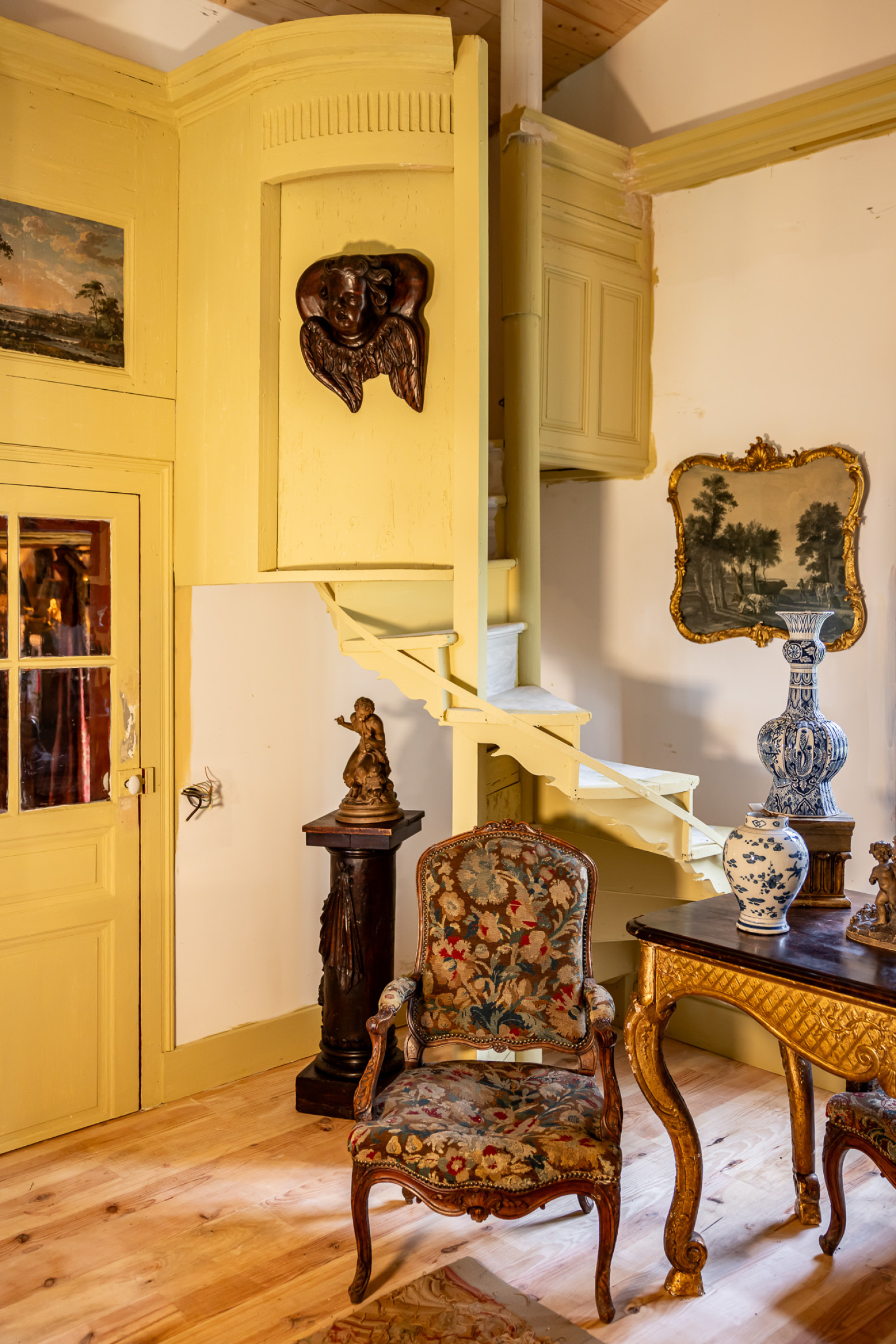 Ses deux encoignures qui encadrent la porte fenêtre ouvrant sur le jardin dissimulent judicieusement le système de chauffage de cette pièce. Le pan de mur opposé, également orné dans un angle d'une armoire d'encoignure aux fonctions identiques, reçoit un escalier dissimulé dans un bâti rappelant les chaires de vérité et conduisant à la chambre de l'étage.