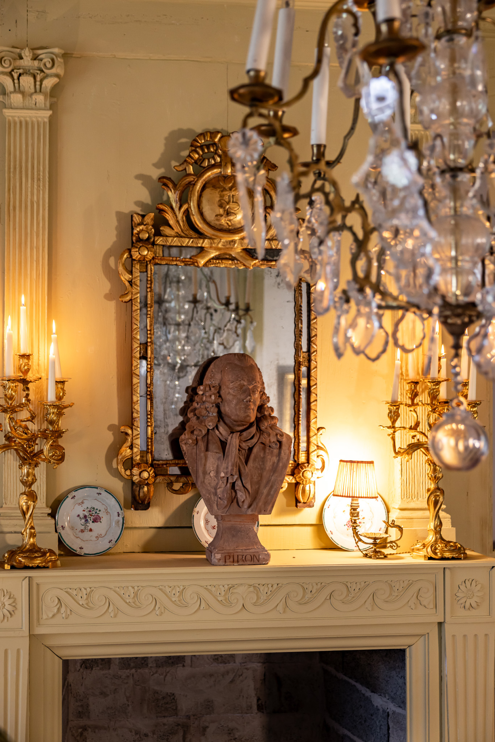 Sa cheminée centrale se compose d'un manteau et de son large trumeau, le tout étant en bois peint. Le manteau de la cheminée est encadré de deux pilastres et surmonté d'un bandeau orné d'une frise. Le trumeau s'élève suivant une construction très architecturée : deux pilastres cannelés soutiennent un entablement et une corniche ornée d'une série de petits modillons.