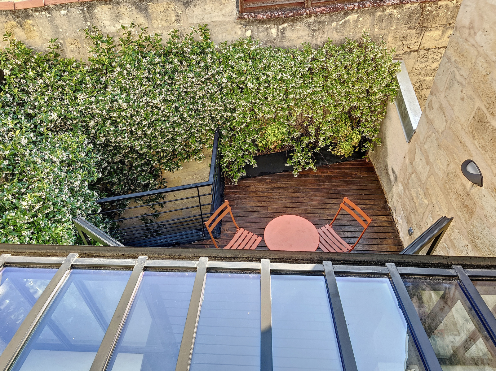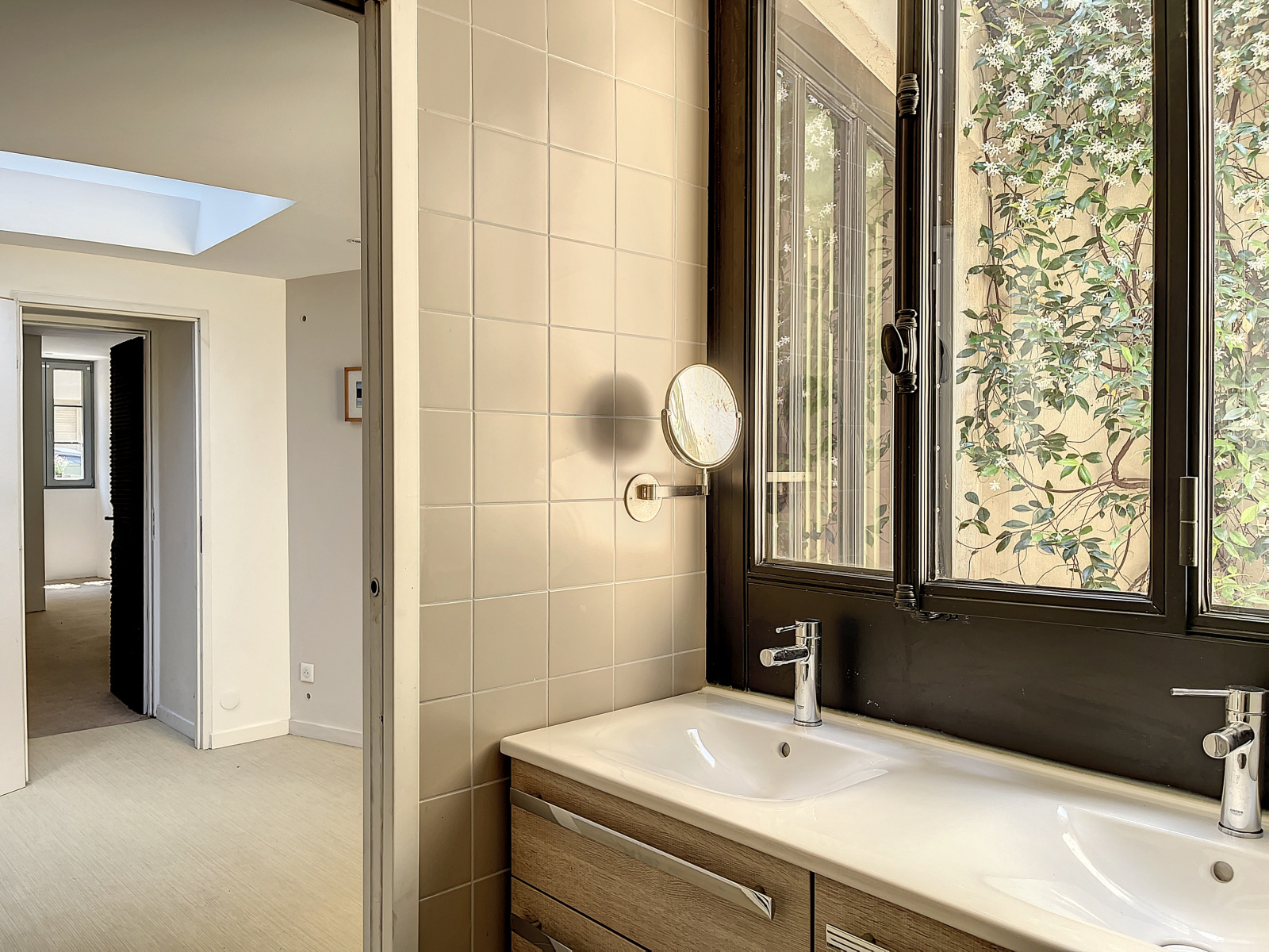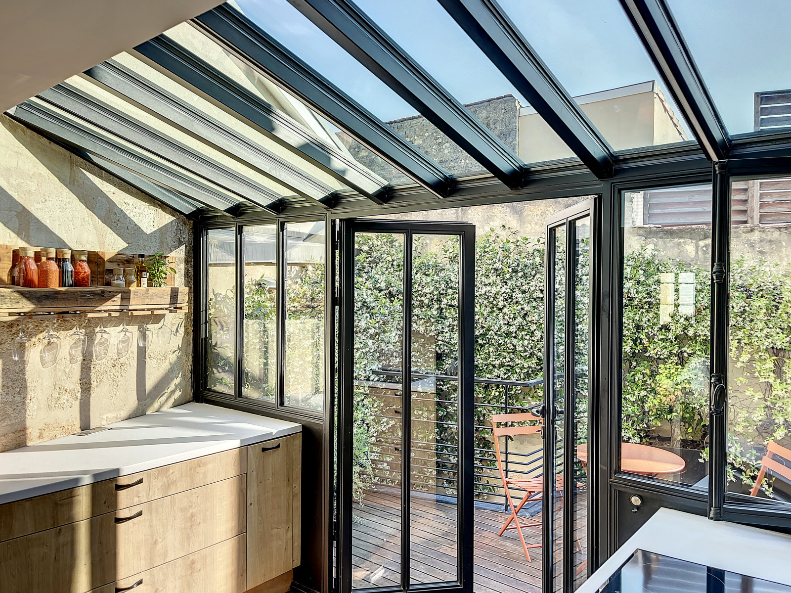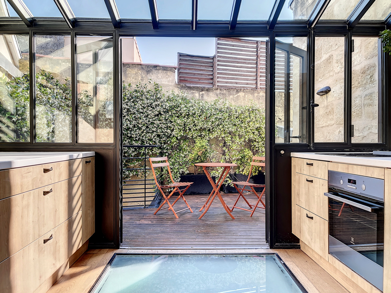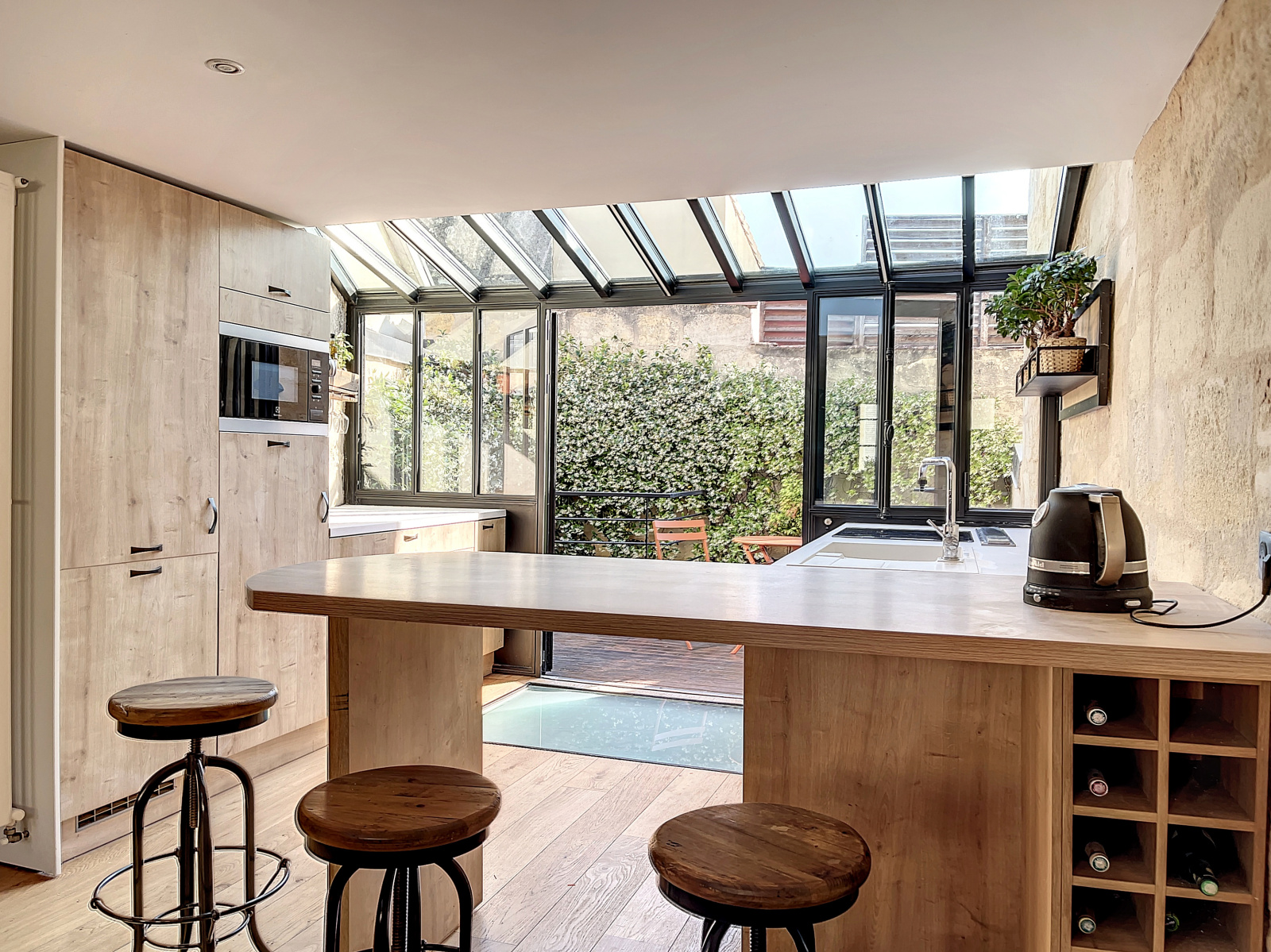 La cuisine, entièrement aménagée et équipée, s'est vu étendue par l'ajout d'une véranda type verrière à l'ancienne, venant compléter cette recherche d'ouverture vers l'extérieur, de respiration à pleins poumons. Elle donne un accès de plain pied à une terrasse végétalisée très intimiste et sans aucun vis à vis.