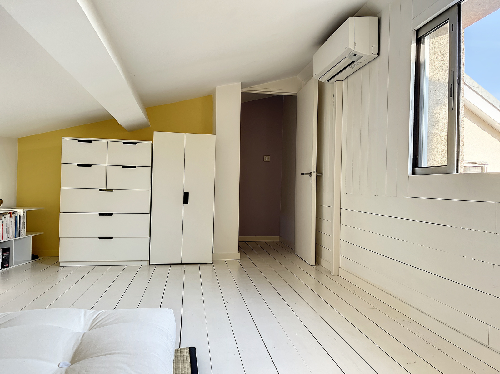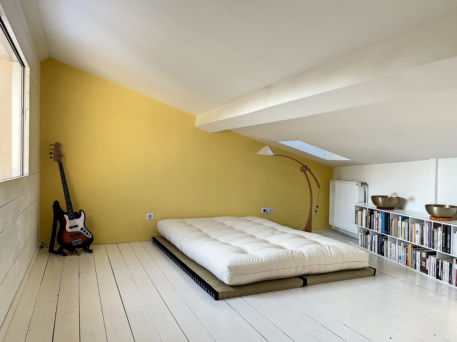 Le second étage abrite une chambre pouvant également faire office de bureau. Tout comme l'espace de vie, cette pièce est baignée de lumière par sa fenêtre coulissante complétée de sa fenêtre de toit. Elle est également climatisée.