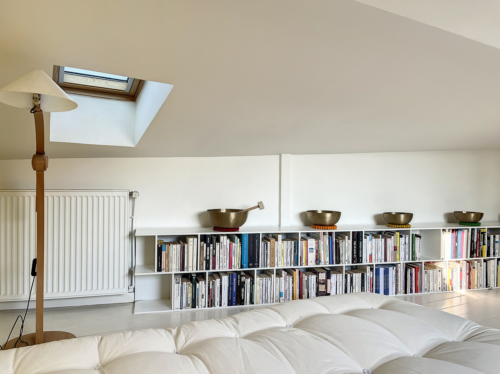 L'espace de vie se situe au premier étage. Des fenêtres de toit judicieusement ouvertes baignent de lumière le salon.