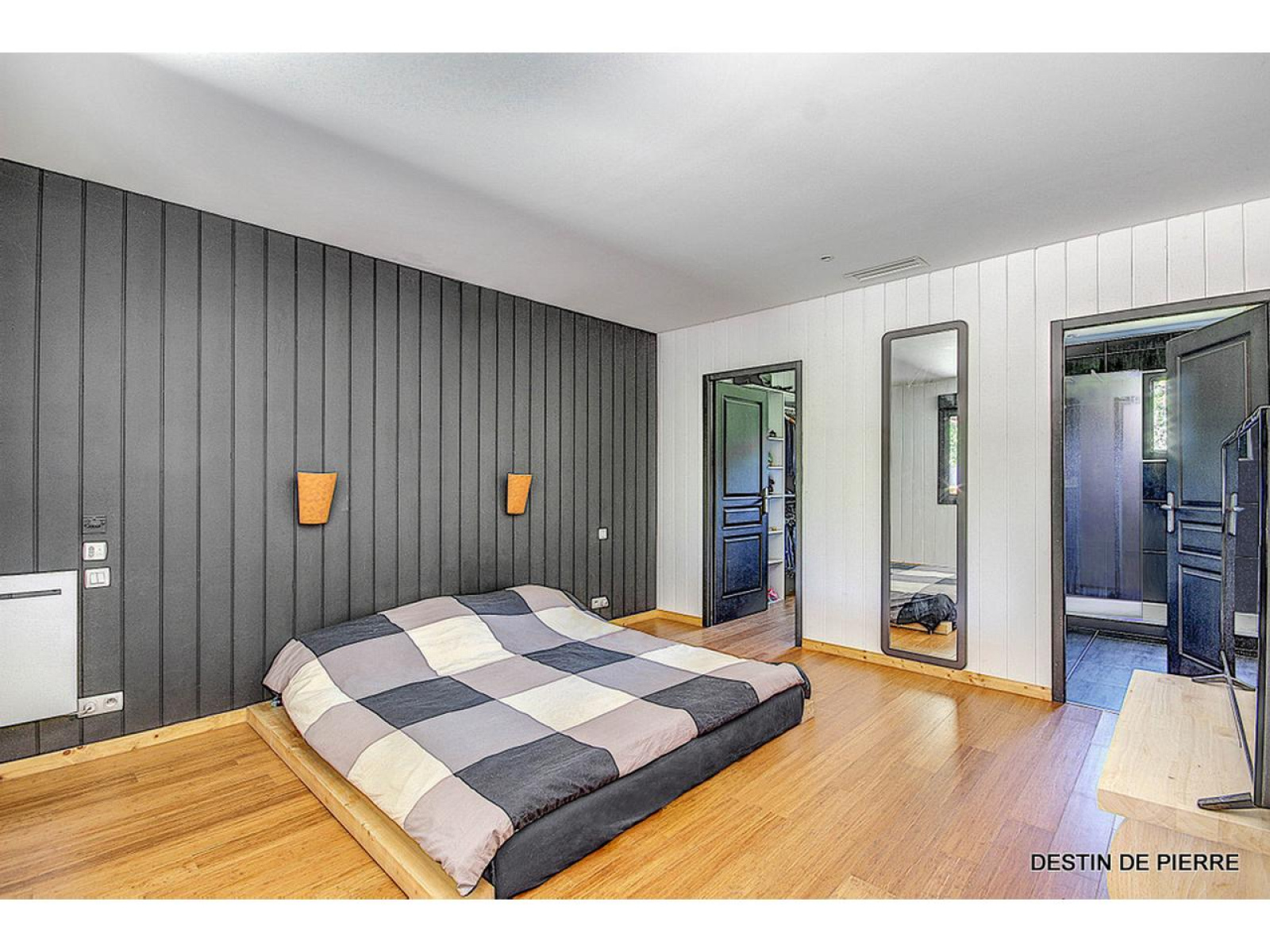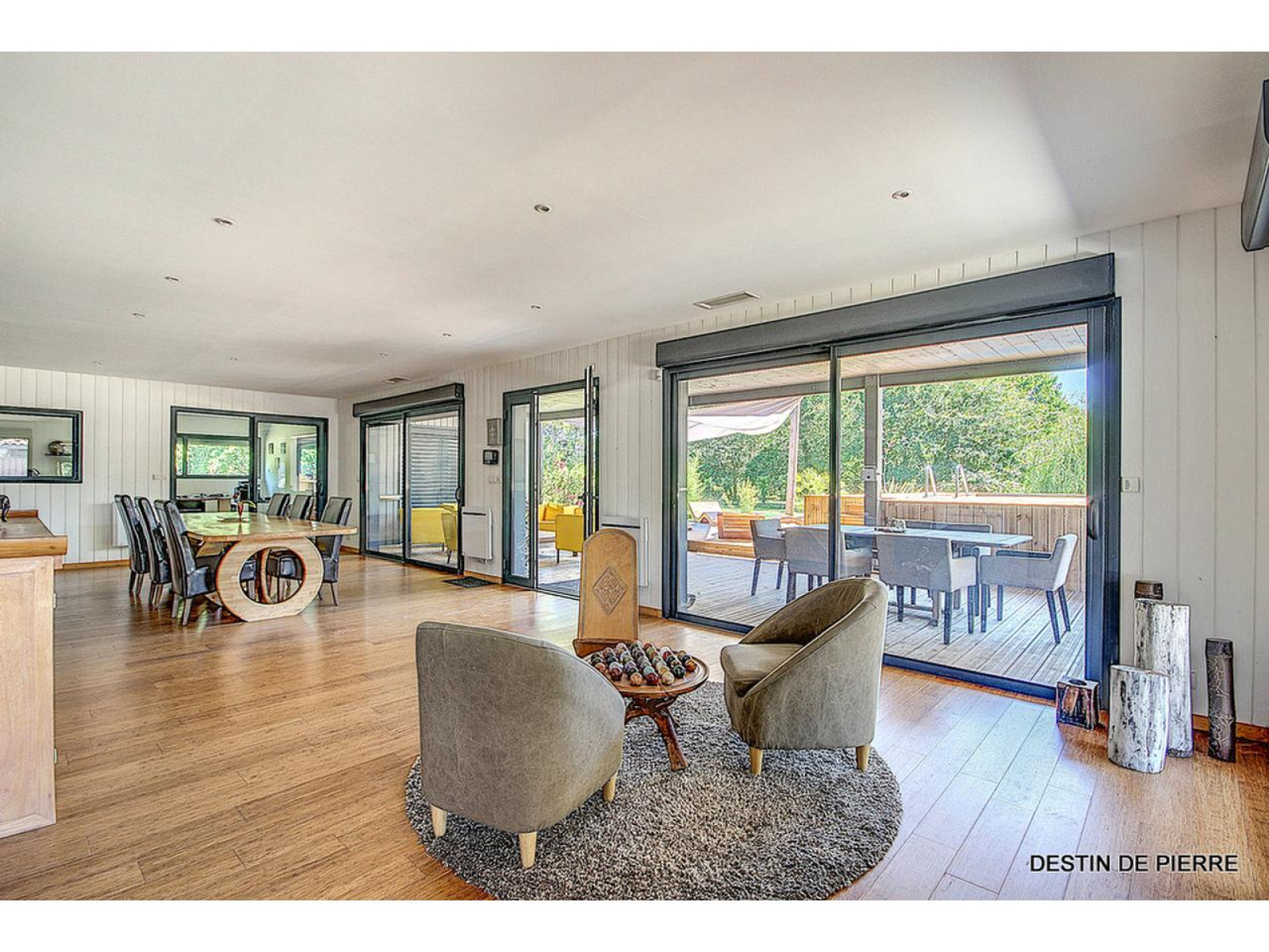 LA VILLA : Entrez dans une belle pièce de vie lumineuse, (le séjour de 46m²), ouverte par de grandes baies vitrées sur la piscine et le parc, donnant sur une cuisine toute équipée ouverte à l'américaine de 15m2. L'ensemble sur un sol en parquet en bambou massif. Une arrière-cuisine de 15m2 est attenante. Des pièces de confort sont présentes telles que buanderie ou cellier... Entrez ensuite dans le grand salon de 85m2 ouvert ou fermé au choix par une porte coulissante sur le séjour accompagné de son bureau ! Le sol est en parquet en pin massif. Possibilité d'installer une cheminée ou un poêle... au milieu de ce salon pour vos soirées d'hiver ! Un couloir distribue 3 chambres (environ 28 m2, 12 m2 et 22m2) dont l'une possède son dressing et sa salle d'eau (fenêtre vitrée donnant sur la piscine). L'ensemble sur un sol en parquet en bambou massif. Wc indépendant et une autre salle d'eau dans le couloir. A l'extrémité de la villa, une autre pièce de 20m2 ouverte par une baie vitrée donnant sur la piscine peut être aménagée en bureau, salle de cinéma ou en quatrième chambre. (Sol en parquet contre collé en chêne)