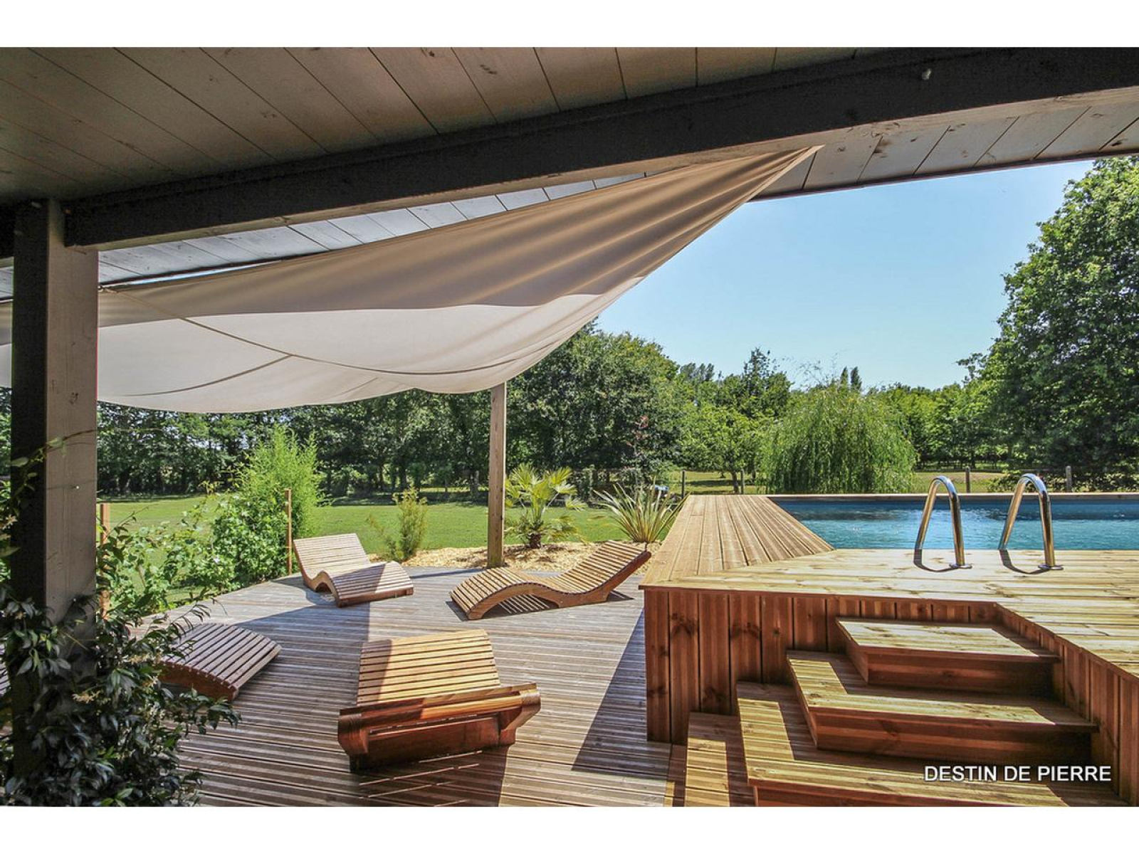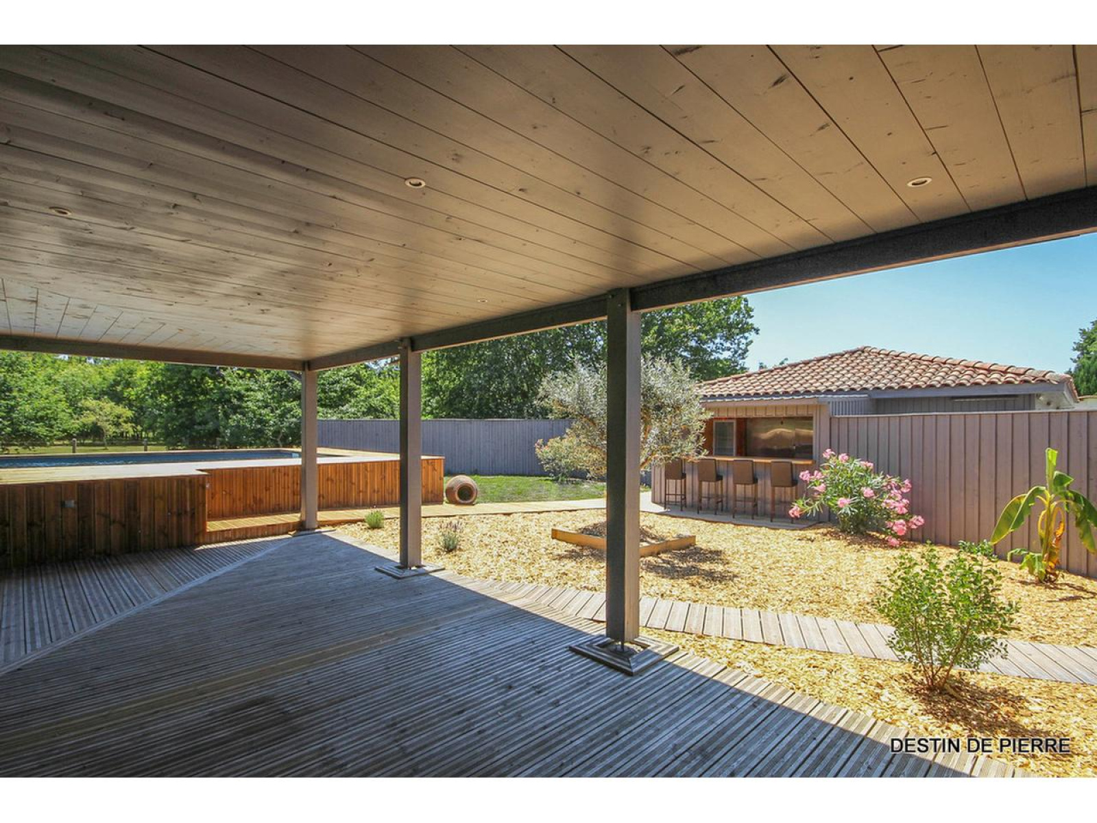 Jardin et Extérieurs Parc de 4 029m2 arboré et clos. Terrasse de 100m2 environ. Portail électrique de type battant, avec visiophone numérique. Deux Garages de 62m2 avec deux portes électriques télécommandées. Espace Piscine Un bassin de 10m x 5m, profondeur 1m50, situé plein sud, chauffé par une pompe à chaleur, liner gris, s'intègre parfaitement dans cet univers privilégié. Traitement de l'eau au sel, robot de nettoyage et alarme de détection par immersion. (Local technique pour la piscine dans le garage) La piscine est entourée par une large terrasse en bois. Espace Pool house. Véritable cuisine d'été accompagnée de son bar ! pour faire durer le plaisir sur la terrasse du pool house... Une vraie petite annexe de la villa !