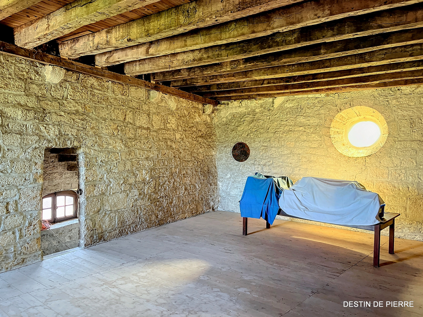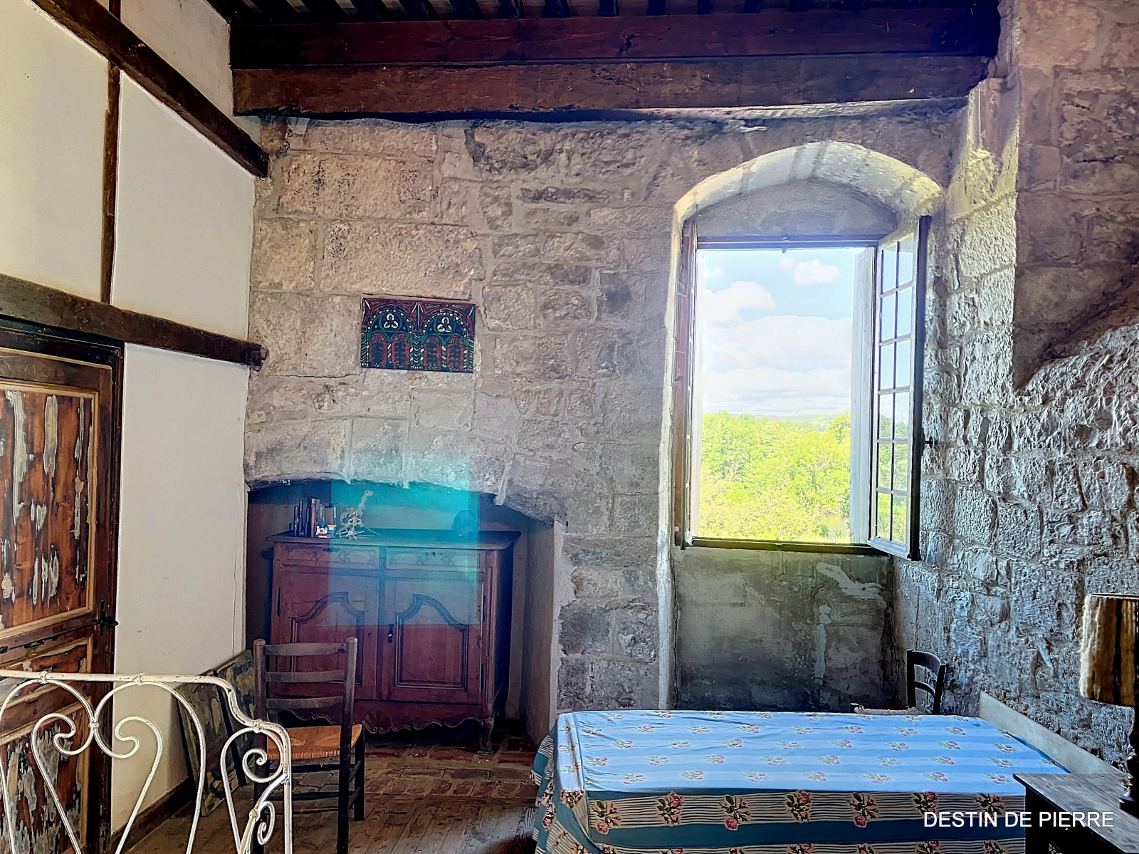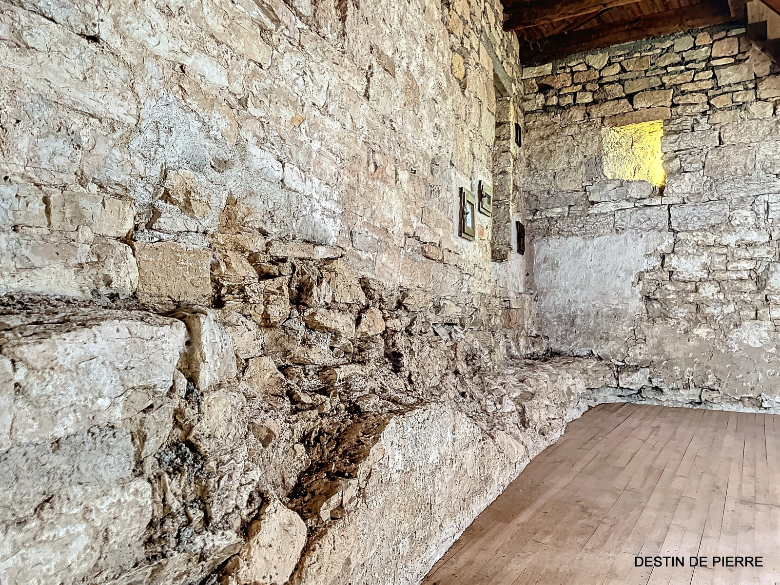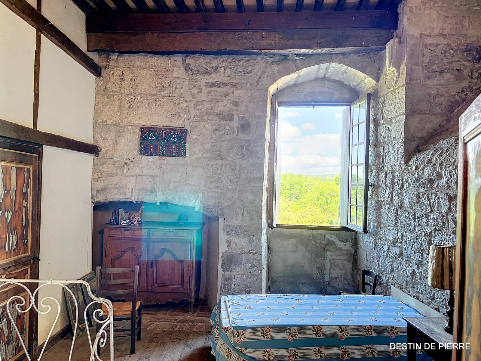 Le « rez-de-chaussée haut » de la tour (1er niveau au-dessus de la cave voûtée) contient 3 chambres de 10m², 15m² et 16,5m², desservies par une entrée avec un très joli pisé au sol, donnant à la fois vers l'escalier de la tour et la pièce à vivre du logis. Celle-ci est prolongée par une petite extension récente, en pierre, contenant des sanitaires (salle de bain et WC).