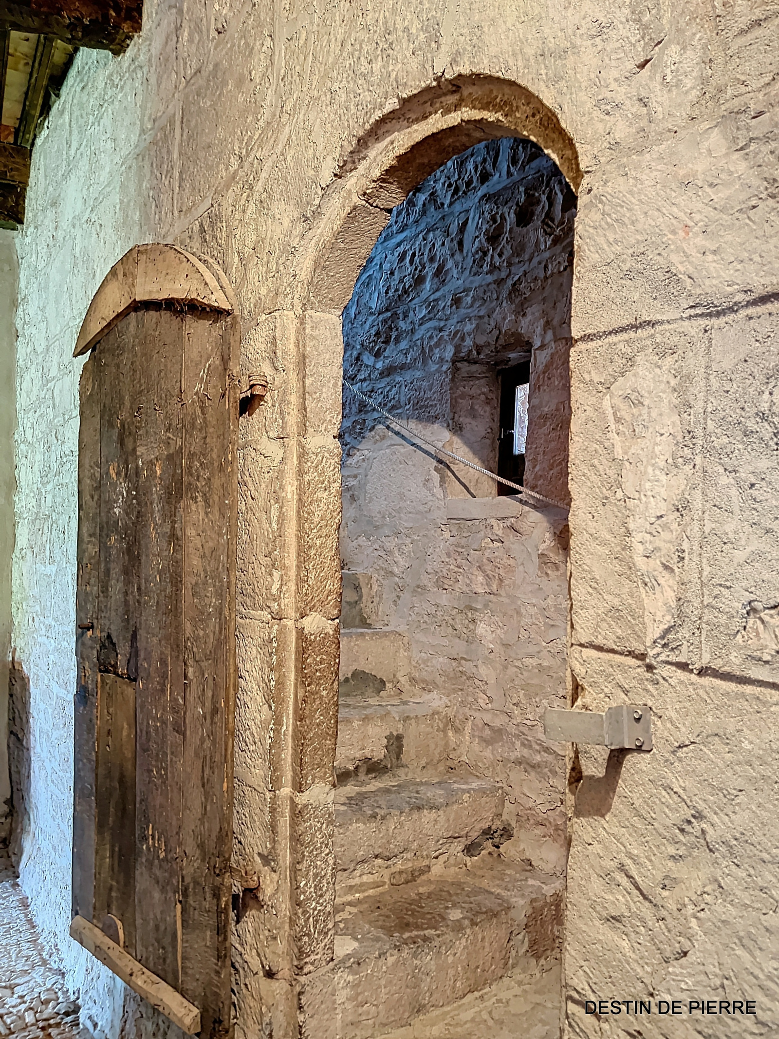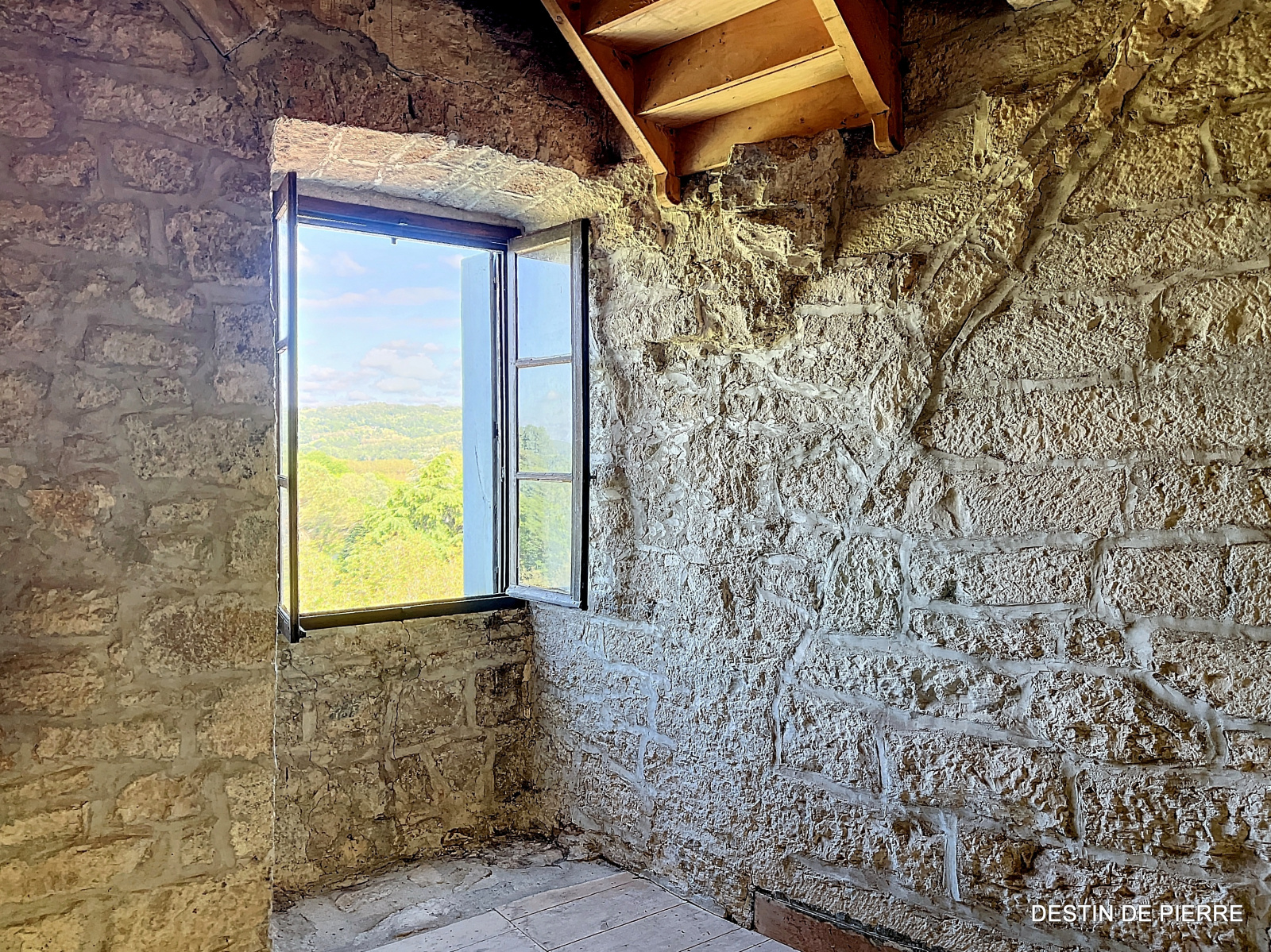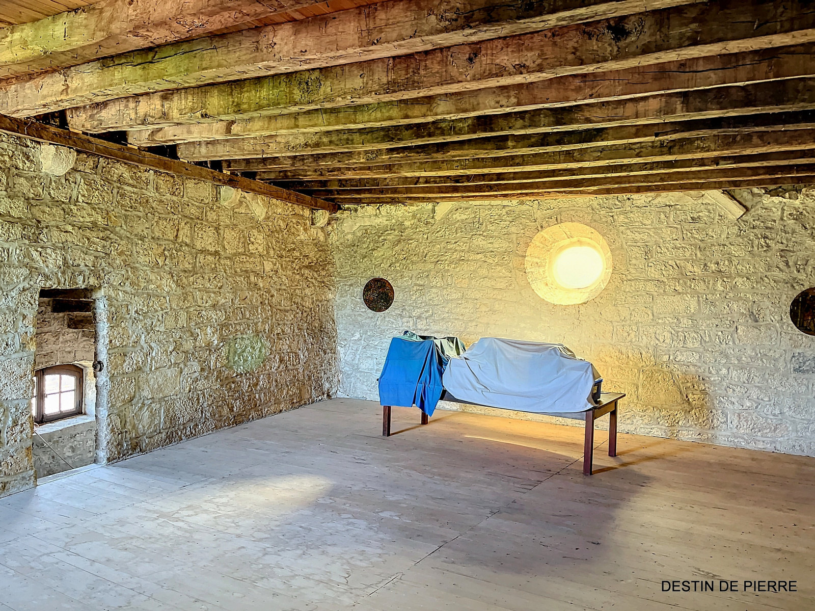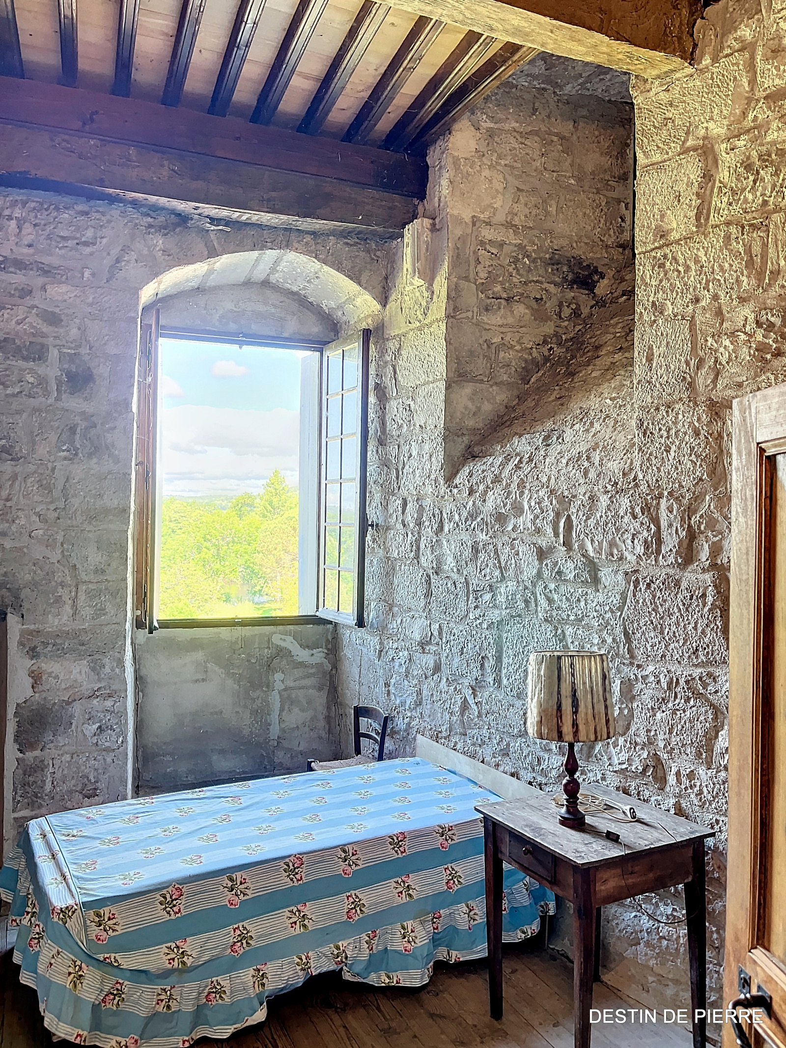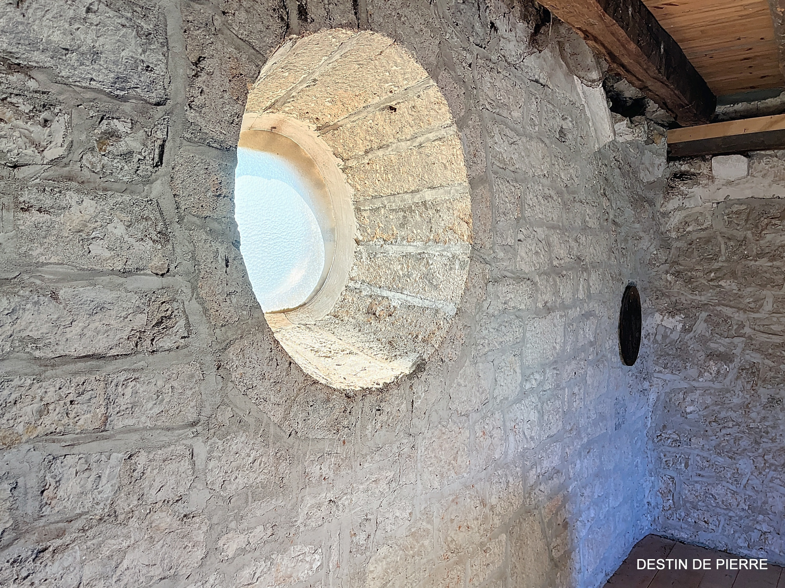 Le « rez-de-chaussée haut » de la tour (1er niveau au-dessus de la cave voûtée) contient 3 chambres de 10m², 15m² et 16,5m², desservies par une entrée avec un très joli pisé au sol, donnant à la fois vers l'escalier de la tour et la pièce à vivre du logis. Celle-ci est prolongée par une petite extension récente, en pierre, contenant des sanitaires (salle de bain et WC).