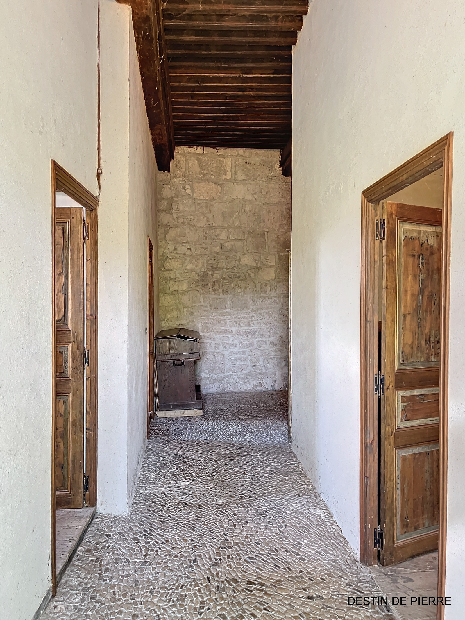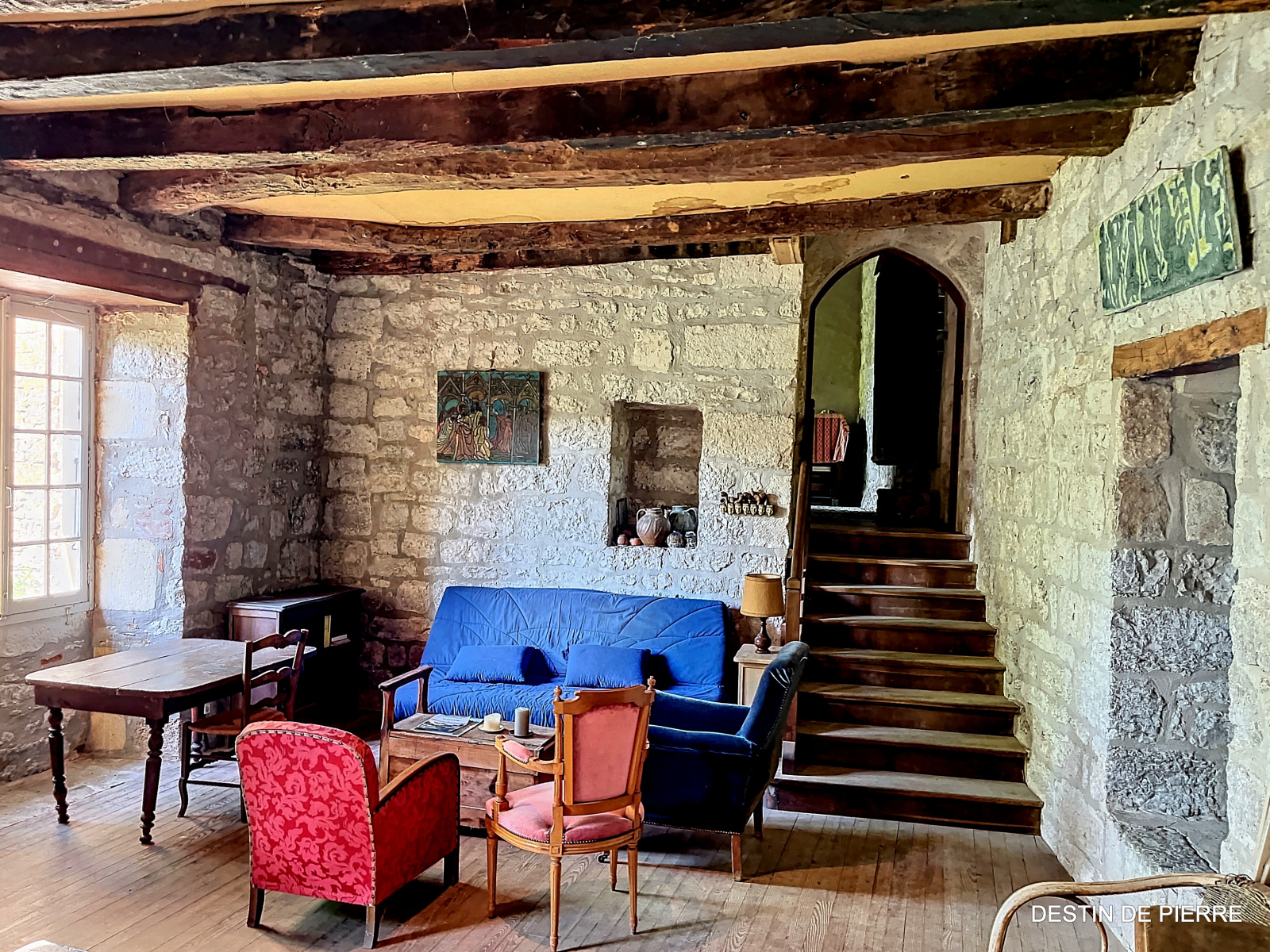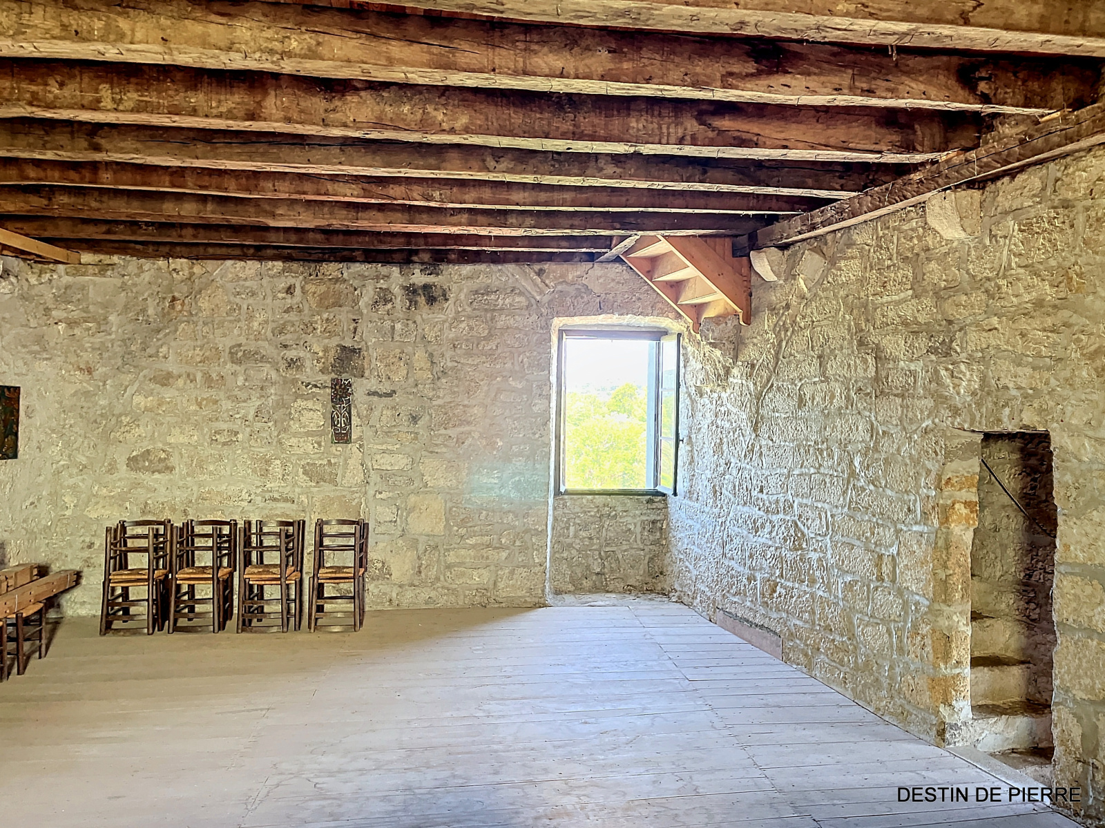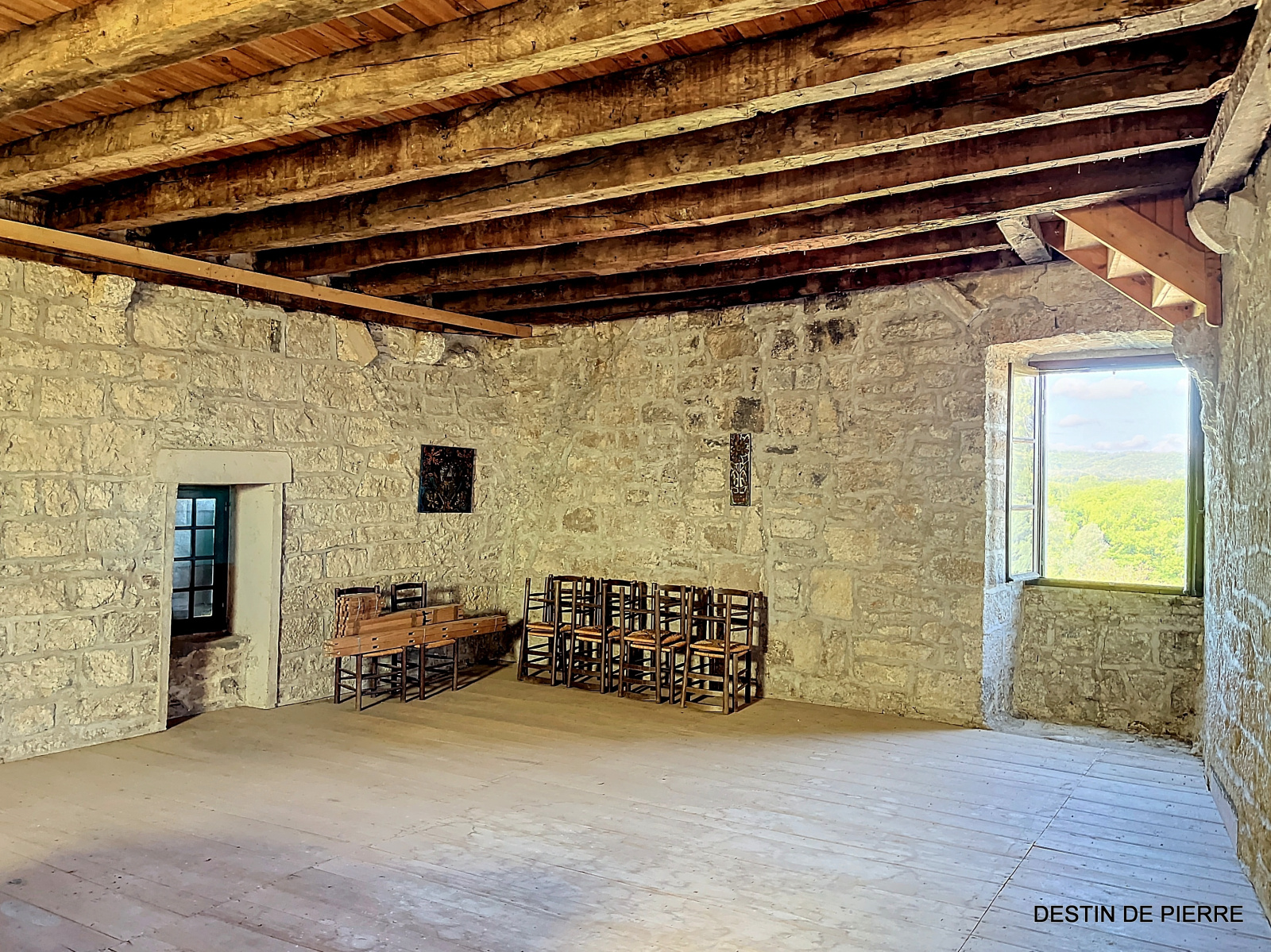 Le « rez-de-chaussée haut » de la tour (1er niveau au-dessus de la cave voûtée) contient 3 chambres de 10m², 15m² et 16,5m², desservies par une entrée avec un très joli pisé au sol, donnant à la fois vers l'escalier de la tour et la pièce à vivre du logis. Celle-ci est prolongée par une petite extension récente, en pierre, contenant des sanitaires (salle de bain et WC).
